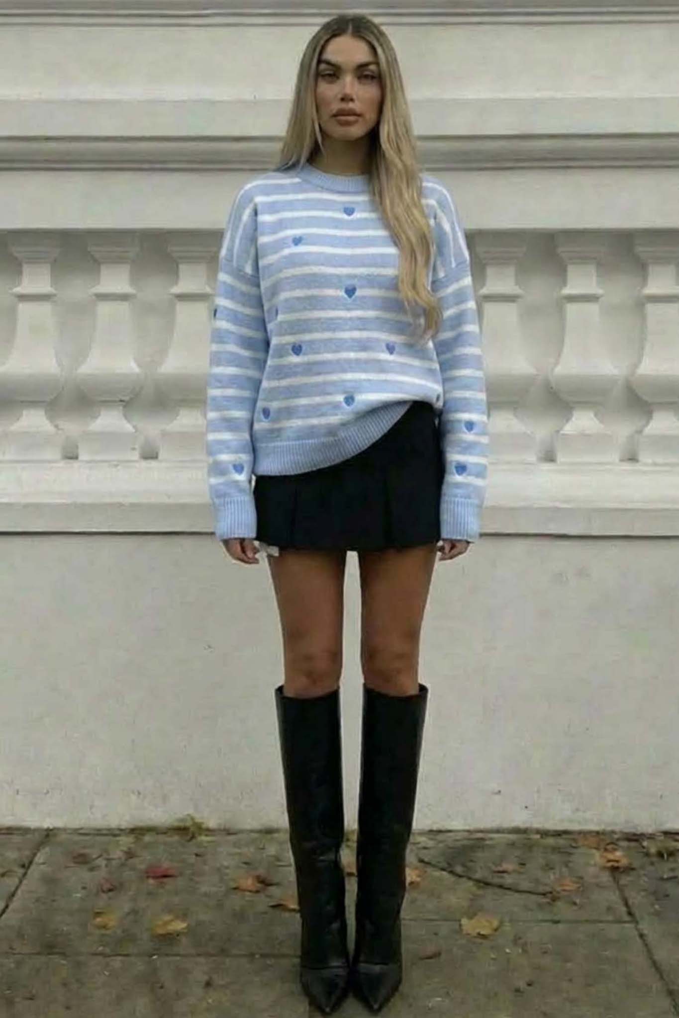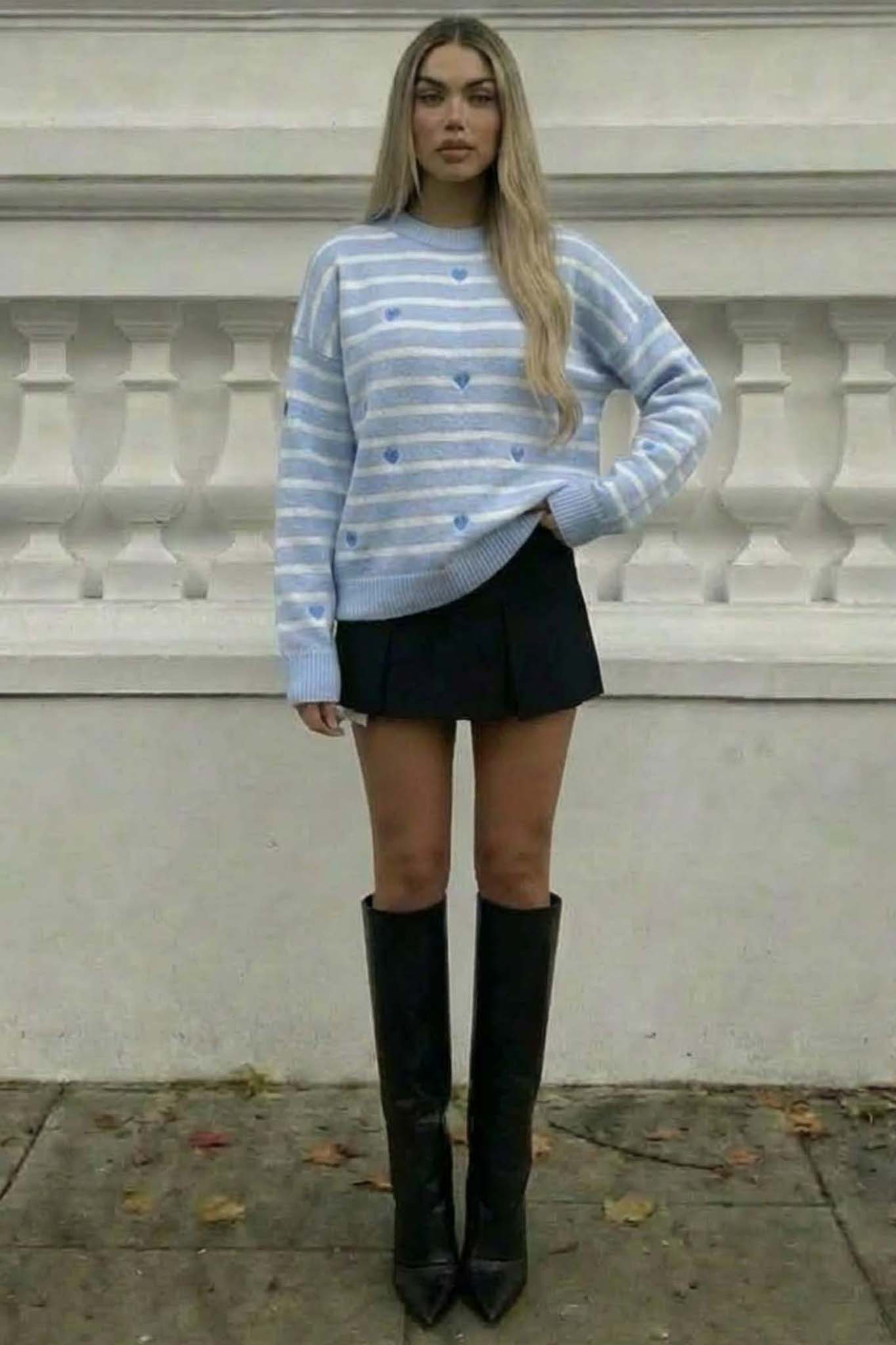Ανανεώστε το στυλ σας με αυτό το πλεκτό πουλόβερ με λευκές οριζόντιες ρίγες και μικρά κόκκινα καρδιές που προσθέτουν παιχνιδιάρικη διάθεση. Διαθέτει στρογγυλή λαιμόκοψη, μακριά μανίκια και άνετη γραμμή για καθημερινή χρήση. Το μαλακό του ύφασμα προσφέρει ζεστασιά και άνεση, ενώ το ρομαντικό σχέδιο το καθιστά ιδανικό για casual εμφανίσεις ή cozy στιγμές. Συνδυάζεται εύκολα με τζιν ή φούστες για ένα χαλαρό αλλά κομψό look.