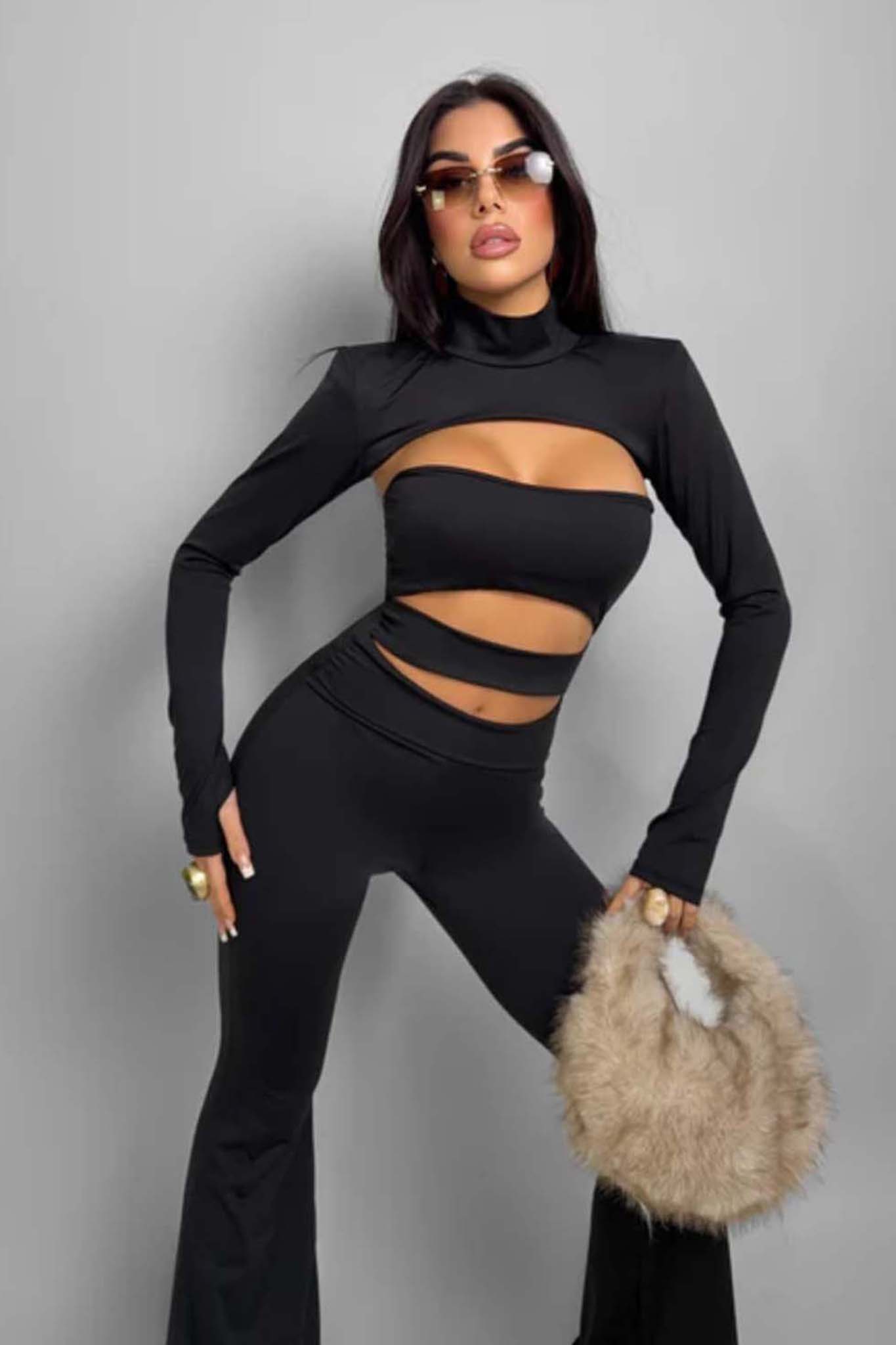 Ολόσωμη φόρμα καμπάνα, μακρυμάνικη ελαστική με cut out στην κοιλιά και το ντεκολτέ. Εφαρμοστή στο σώμα. Ιδανική επιλογή για party looks, επίσημες εμφανίσεις.