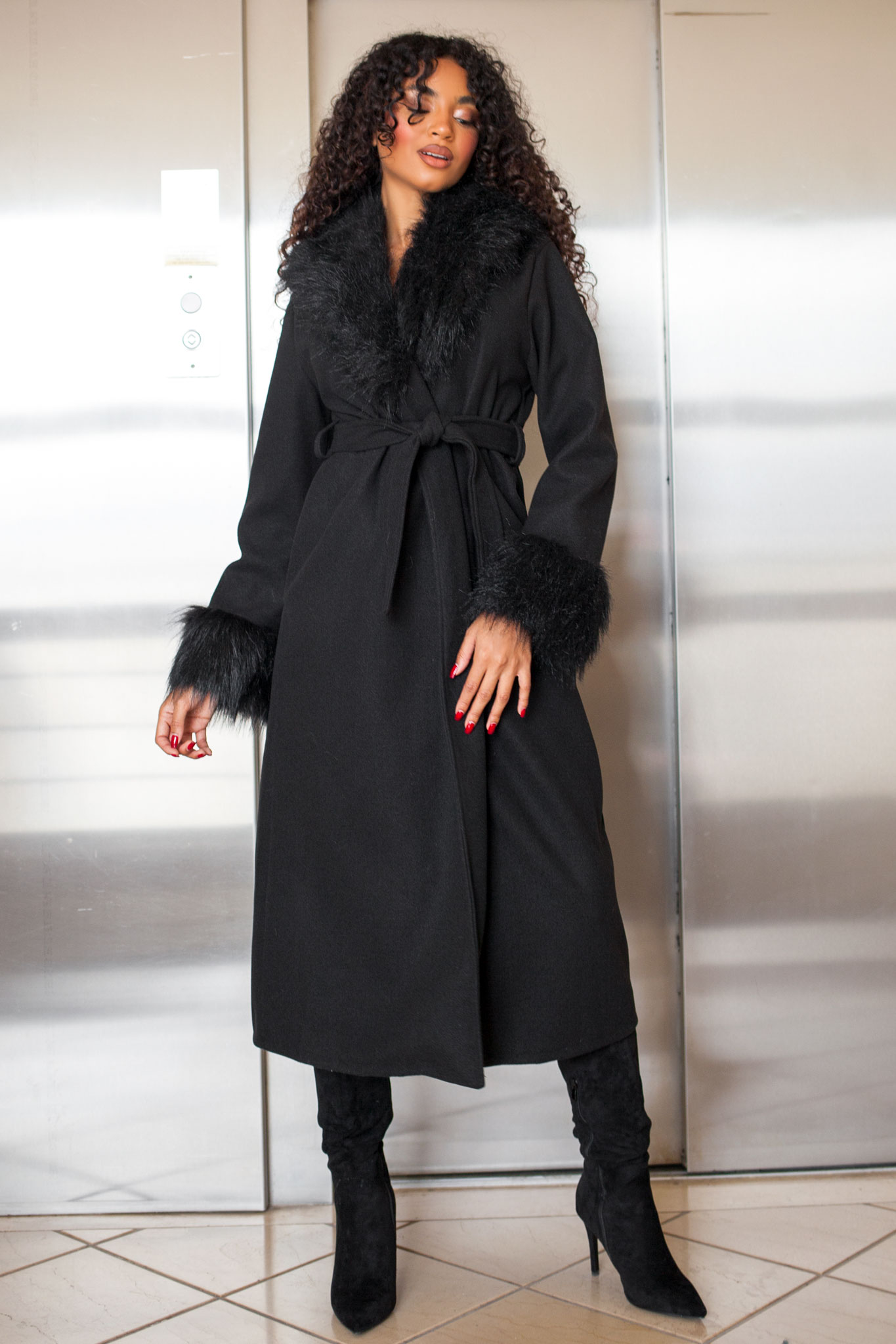 Παλτό, μονόχρωμο και classy με γούνα στα μανίκια και τον γιακά και δέσιμο στην μέση. μήκος 110, στήθος 45,μανίκι 55.