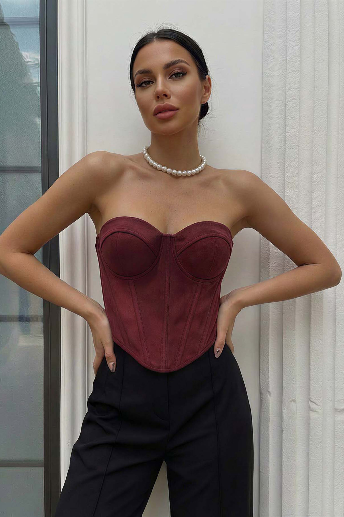 Εντυπωσιάστε με αυτόν τον σουέντ κορσέ, σχεδιασμένο με εσωτερικές μπανέλες και ενισχυμένα cups που προσφέρουν άψογη σμίλευση και υποστήριξη. Η στράπλες γραμμή του και το ασύμμετρο τελείωμα αναδεικνύουν τη θηλυκότητα, καθιστώντας τον το ιδανικό statement κομμάτι για κάθε βραδινή σας έξοδο. Συνδυάζεται τέλεια με ψηλόμεσα παντελόνια για ένα κομψό και σύγχρονο look.