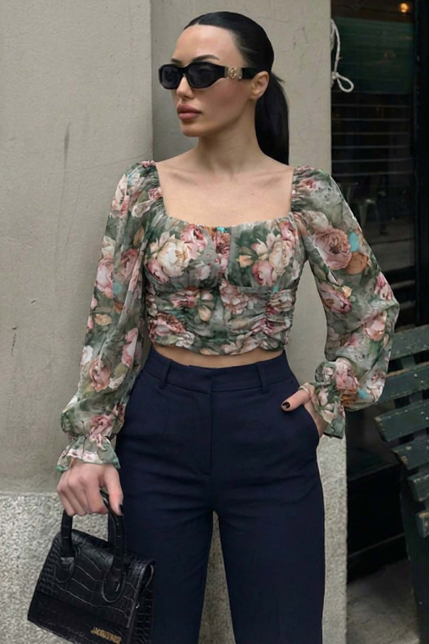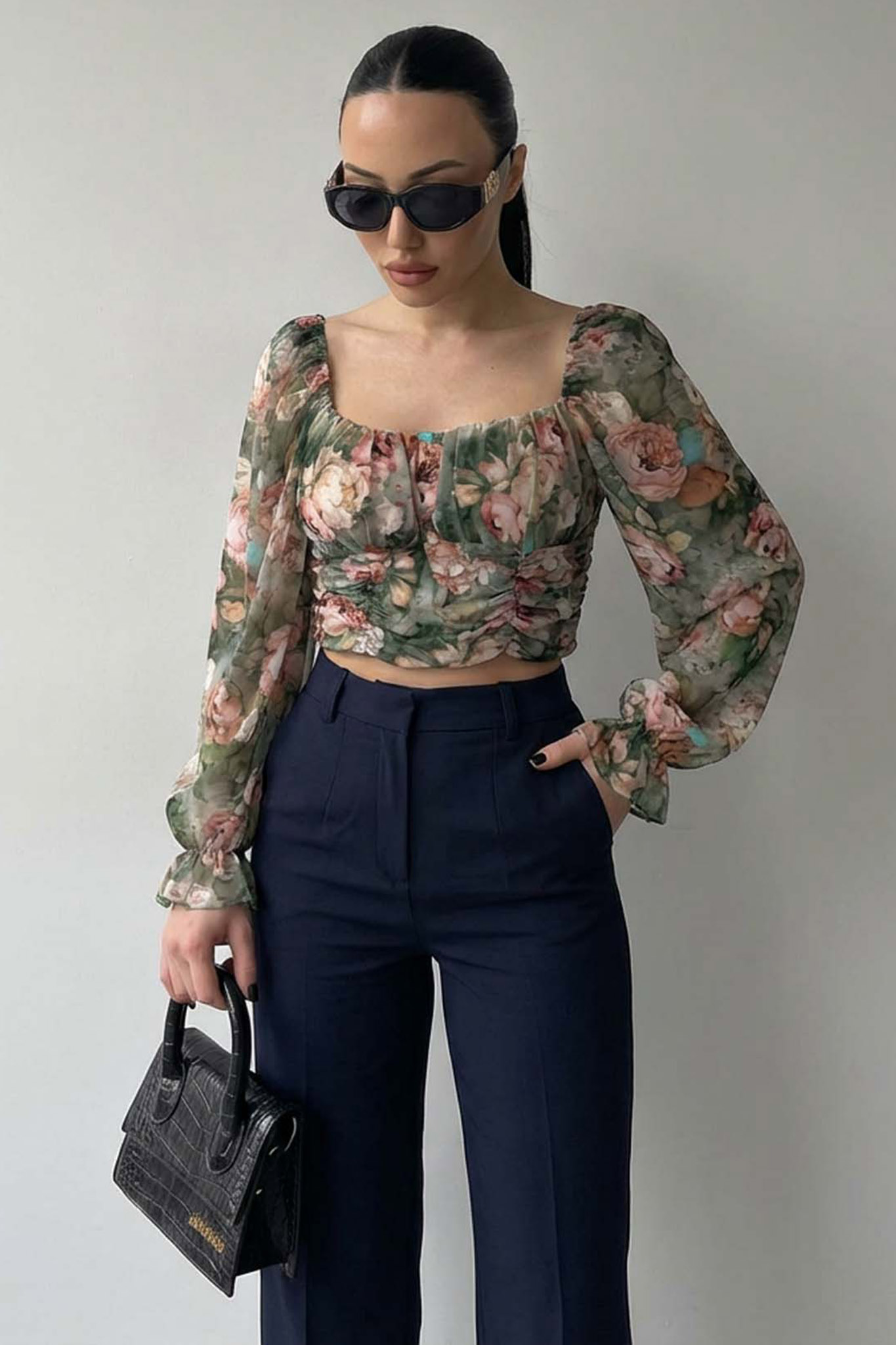 cropped μπλούζα συνδυάζει τη ρομαντική αισθητική με τις σύγχρονες τάσεις. Διαθέτει θηλυκή τετράγωνη λαιμόκοψη, εντυπωσιακά ημιδιάφανα balloon μανίκια και λεπτομέρειες με σούρες. Mήκος 42cm, στήθος 40cm, μανίκι 65cm.