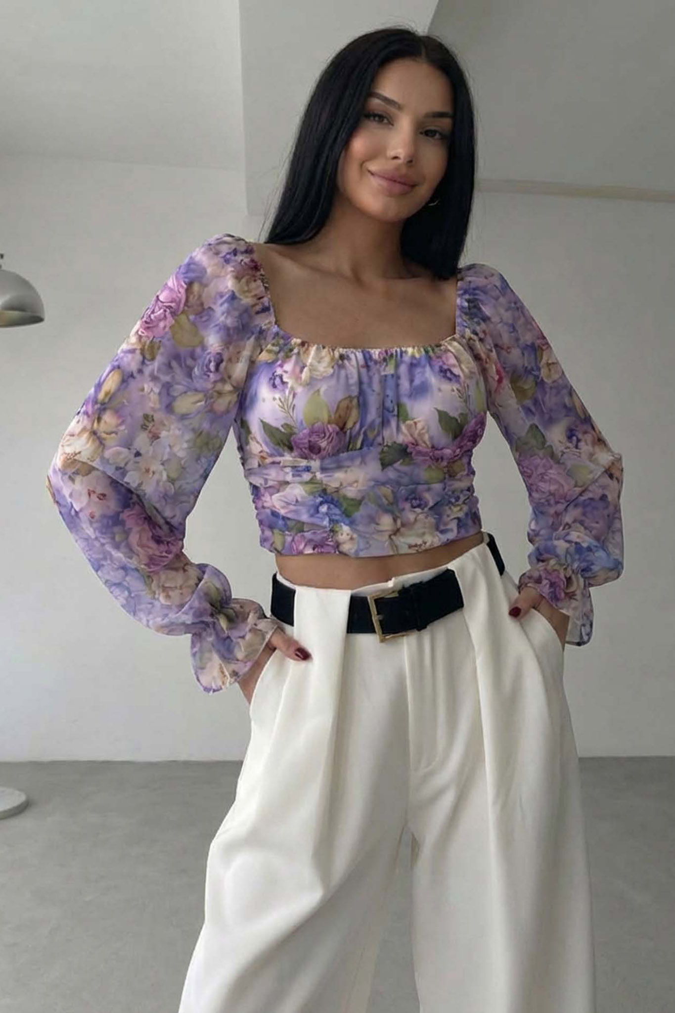 cropped μπλούζα συνδυάζει τη ρομαντική αισθητική με τις σύγχρονες τάσεις. Διαθέτει θηλυκή τετράγωνη λαιμόκοψη, εντυπωσιακά ημιδιάφανα balloon μανίκια και λεπτομέρειες με σούρες. Mήκος 42cm, στήθος 40cm, μανίκι 65cm.
