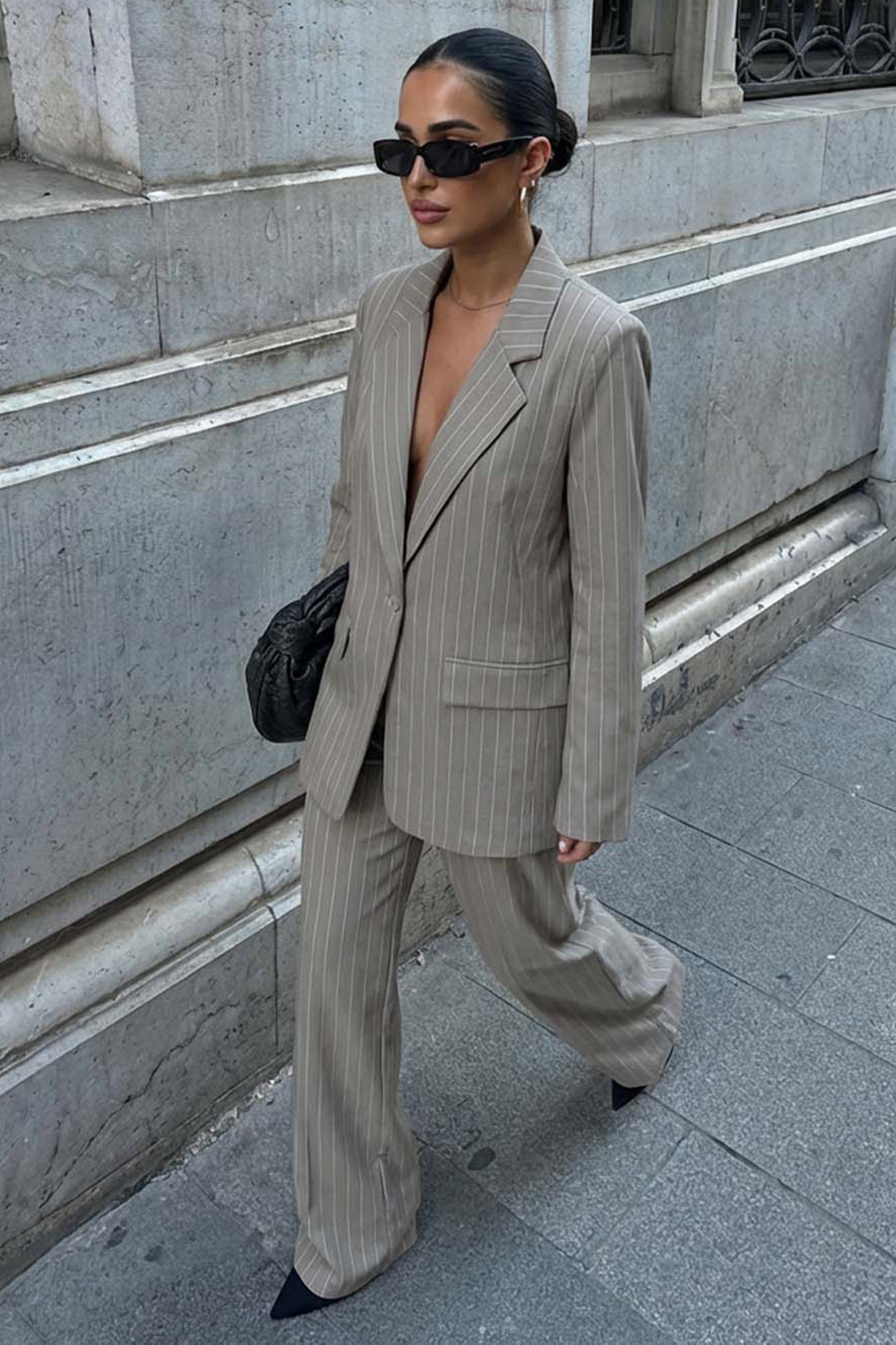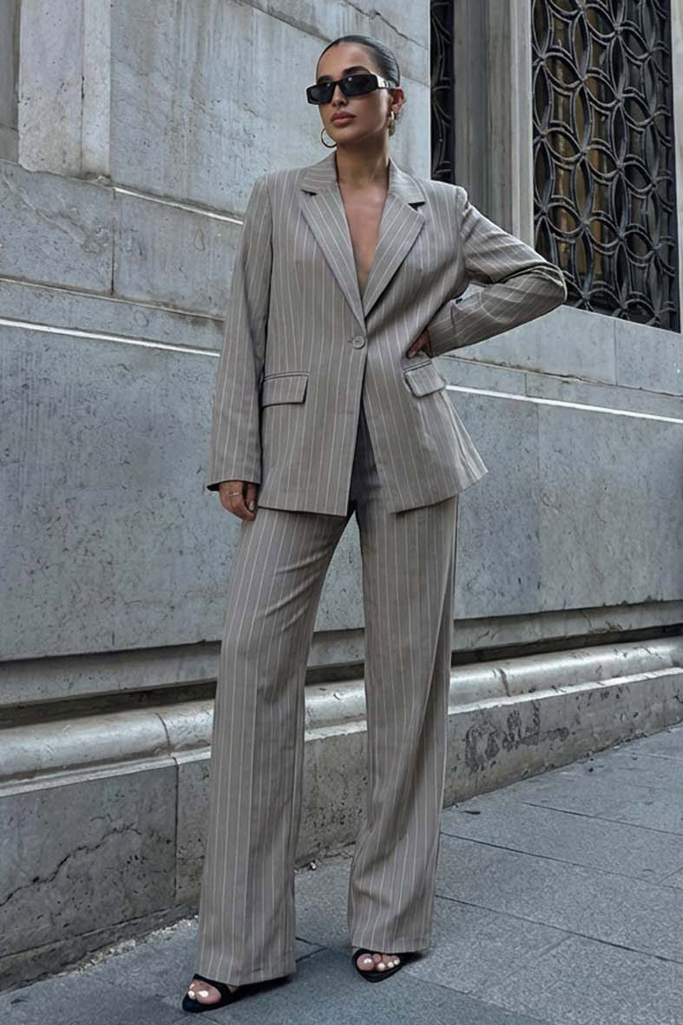 Το σύνολο αποτελείται από ένα oversized σακάκι με κλασικό πέτο, βάτες για δομημένο σχήμα και μπροστινές τσέπες, το οποίο συνδυάζεται άψογα με μια ψηλόμεση παντελόνα σε άνετη, φαρδιά γραμμή.