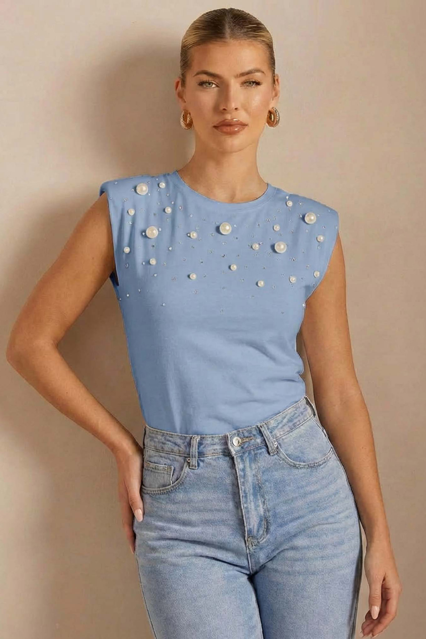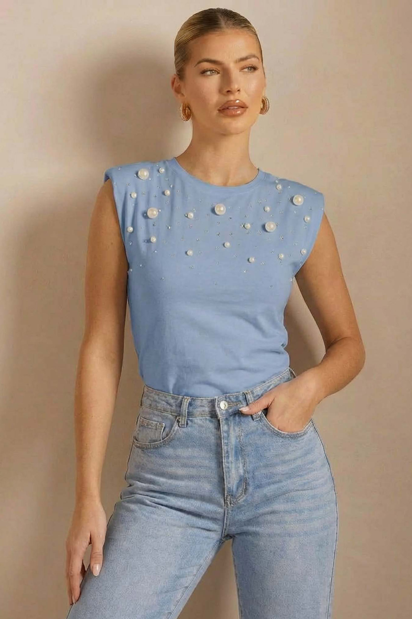Αμάνικη μπλούζα η οποία διαθέτει ενσωματωμένες βάτες που δίνουν ένταση στους ώμους και είναι διακοσμημένη με πέρλες και στρας για μια διακριτική λάμψη. Η άνετη γραμμή της την καθιστά ιδανική για casual glam εμφανίσεις, συνδυάζοντας τέλεια την άνεση με την κομψότητα.