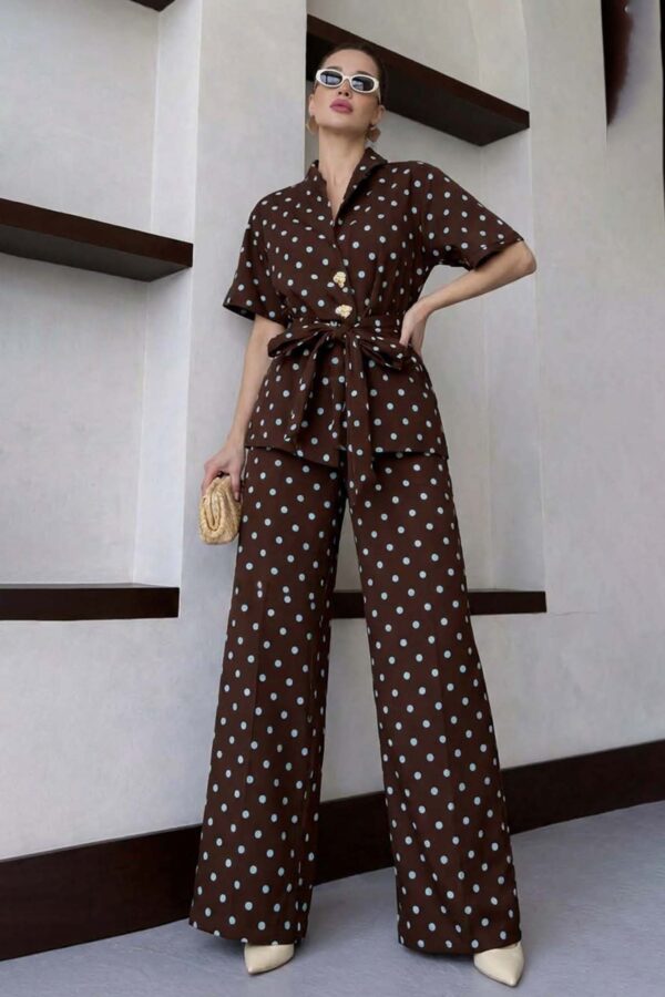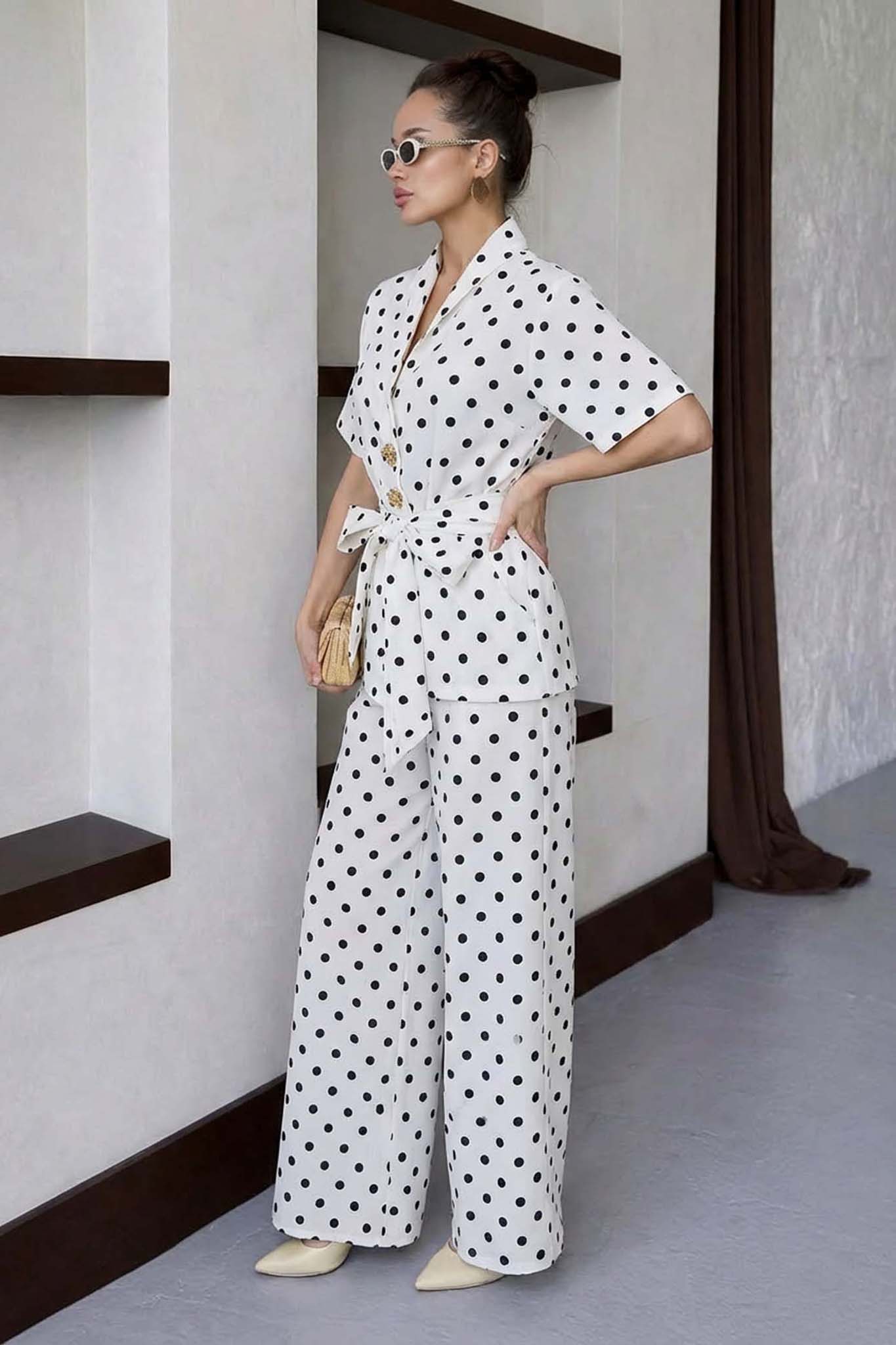 Σετ δύο τεμαχίων με το κλασικό πουά μοτίβο συνδυάζει την κομψότητα με την άνεση, διαθέτοντας ένα πουκάμισο με κοντά μανίκια, γιακά με πέτο και ζώνη από το ίδιο ύφασμα που σφίγγει στη μέση για θηλυκή εφαρμογή. Η παντελόνα σε φαρδιά, αέρινη γραμμή προσφέρει ελευθερία κινήσεων και μια κομψή σιλουέτα, καθιστώντας το σύνολο ιδανική επιλογή για προσεγμένες εμφανίσεις με διαχρονικό χαρακτήρα
