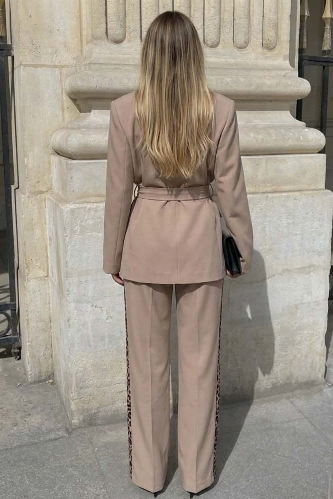 Σετ που αποτελείται από σακάκι και παντελόνι με εσωματωμένη ζώνη που αναδεικνύει την σιλουέτα. Στους απόλυτους χρωματιμσούς του χειμώνα και διακοσμητική λέοπαρ print ρίγα στο πλάι και στις τσέπες. Προσφέρει ένα κομψό αποτέλεσμα. Ιδανική επιλογή για καθημερινές προσεγμένες εμφανίσεις και office looks. Συνδιασμός και με sneakers και με γόβα.
