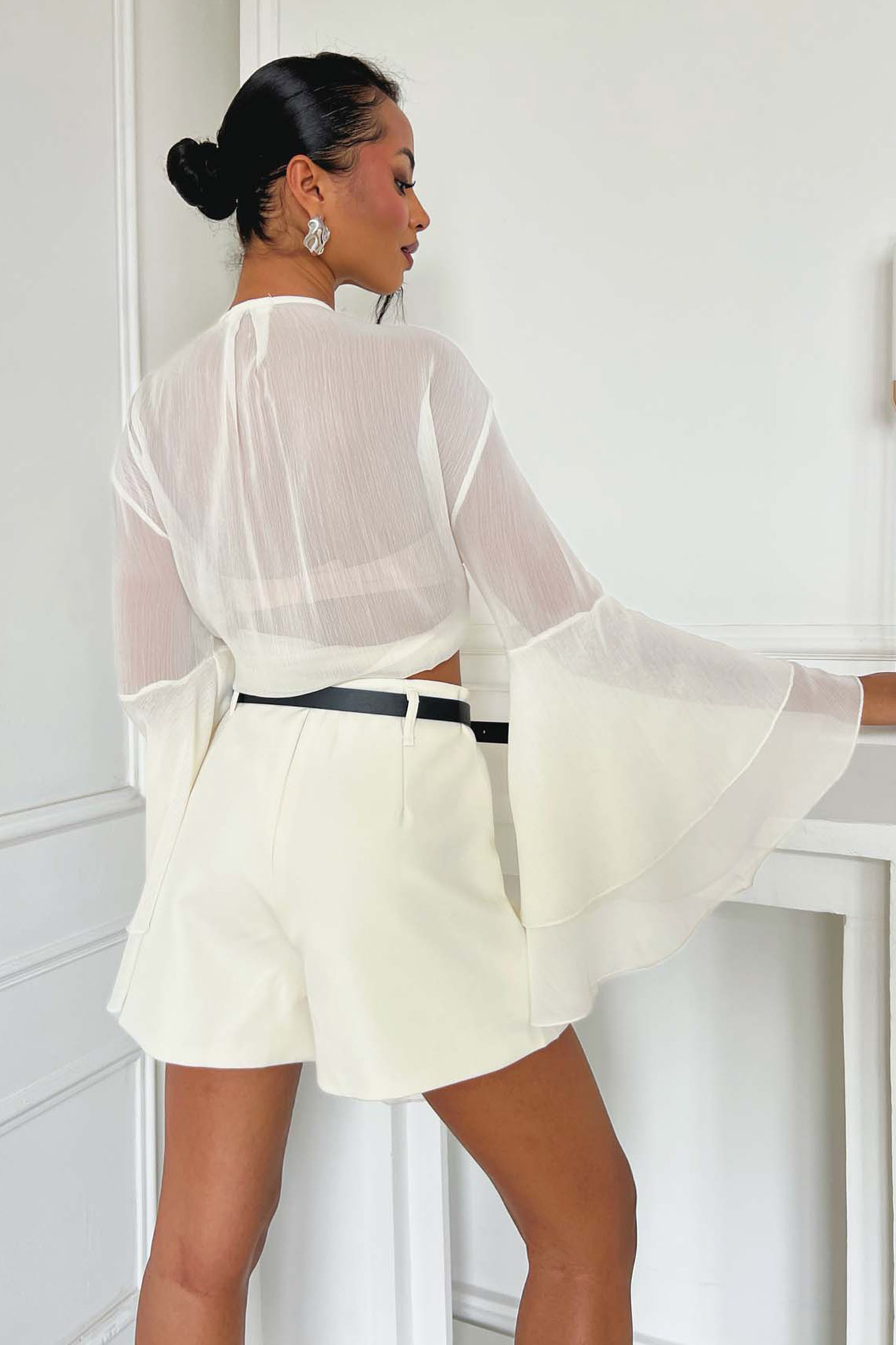 Ημιδιάφανο τοπ από ανάλαφρο ύφασμα,πλούσια βολάν που στολίζουν το μπροστινό μέρος και μανίκια καμπάνα. Διαθέτει κομψό δέσιμο στο στήθος που επιτρέπει να προσαρμόσετε το άνοιγμα στο V.Είναι το απόλυτο boho-chic κομμάτι που θα αναβαθμίσει κάθε βραδινή σας εμφάνιση.