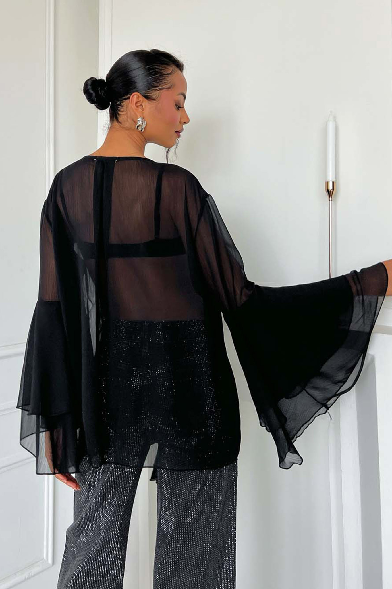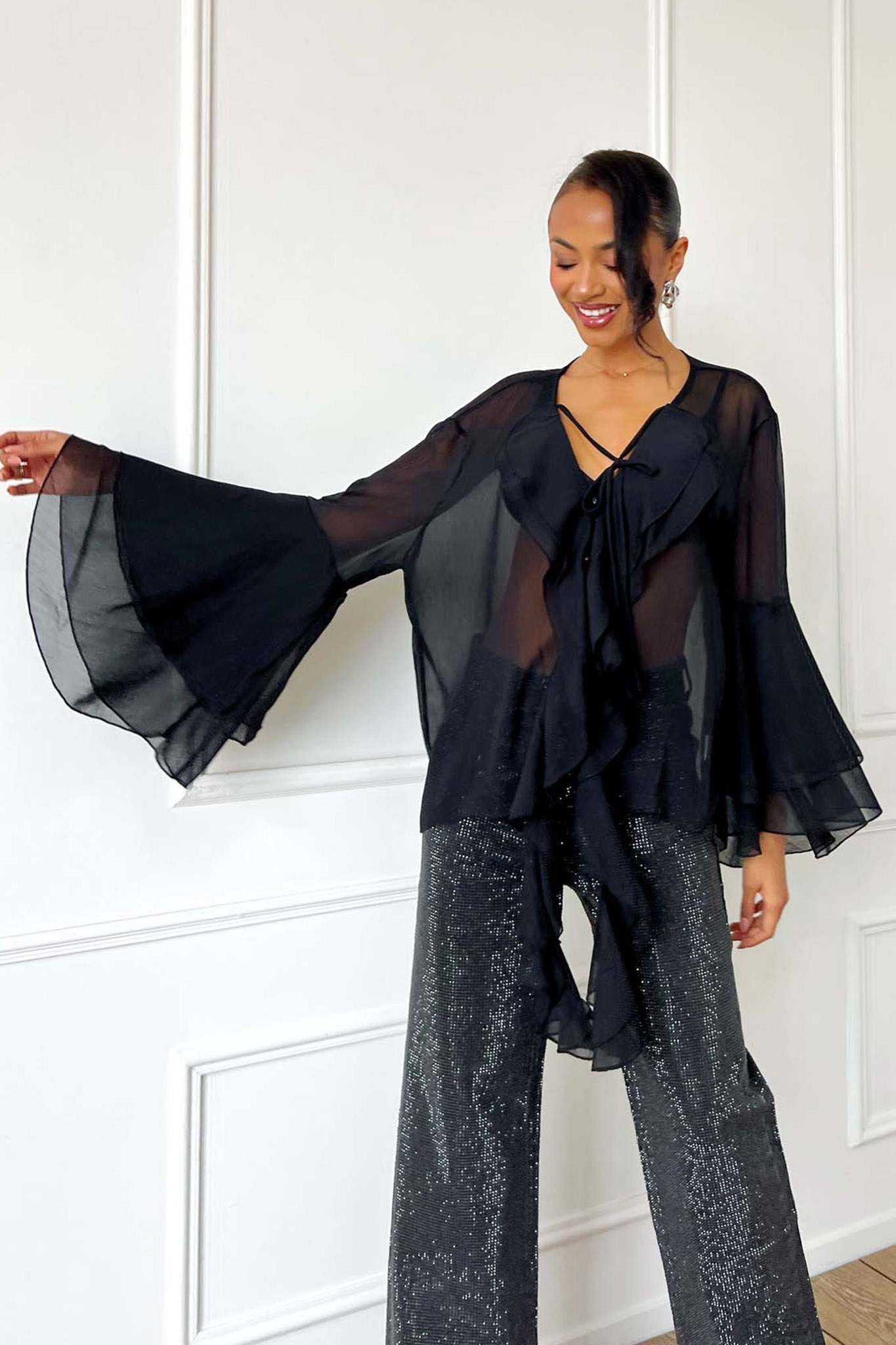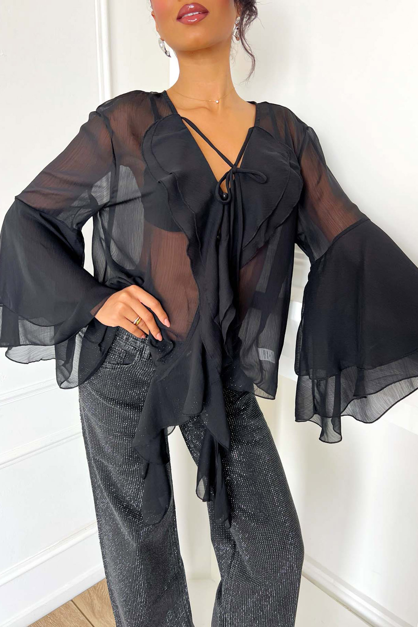 Ημιδιάφανο τοπ από ανάλαφρο ύφασμα,πλούσια βολάν που στολίζουν το μπροστινό μέρος και μανίκια καμπάνα. Διαθέτει κομψό δέσιμο στο στήθος που επιτρέπει να προσαρμόσετε το άνοιγμα στο V.Είναι το απόλυτο boho-chic κομμάτι που θα αναβαθμίσει κάθε βραδινή σας εμφάνιση.