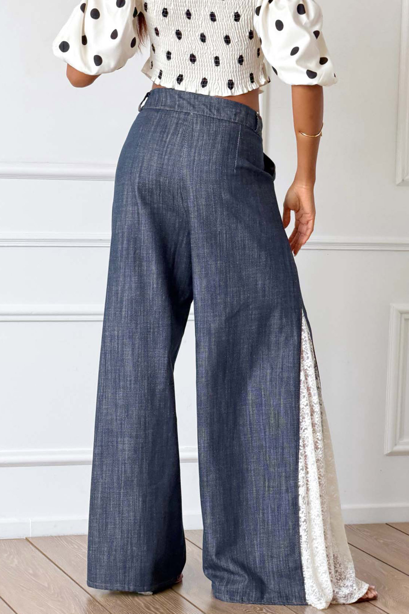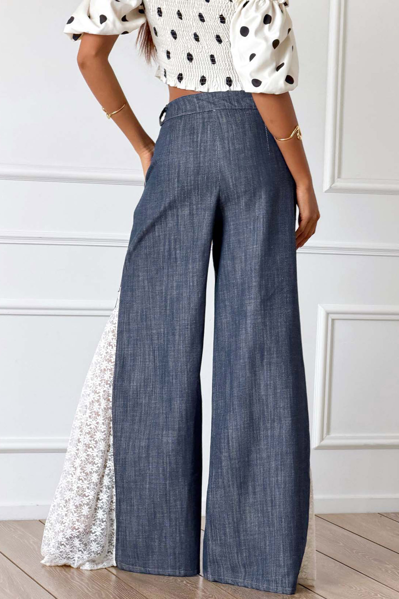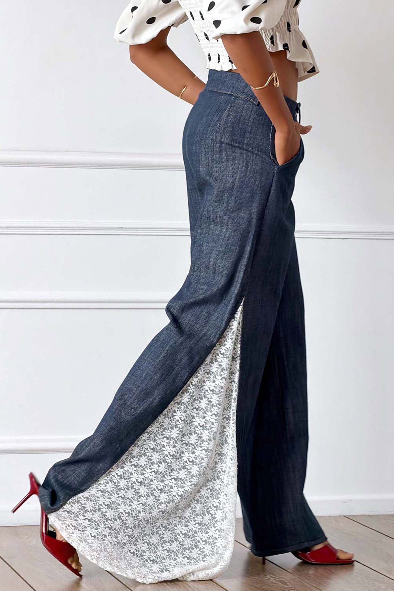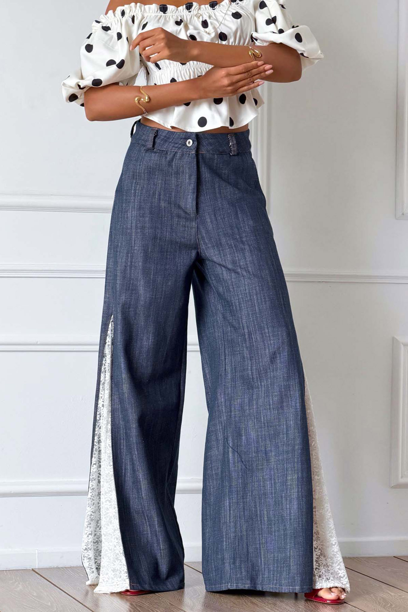 Denim παντελόνα με δαντέλα, δημιουργώντας ένα μοναδικό boho-chic αποτέλεσμα. Mήκος 113cm