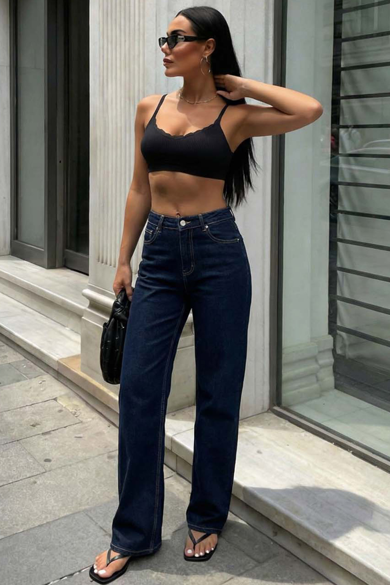Ψηλόμεσο τζιν σε σκούρα μπλε απόχρωση προσφέρει μια κομψή και διαχρονική αισθητική, χάρη στην ίσια γραμμή του που επιμηκύνει τη σιλουέτα. Το σταθερό του ύφασμα και οι κλασικές ραφές το καθιστούν το απόλυτο “must-have” για κάθε γκαρνταρόμπα.