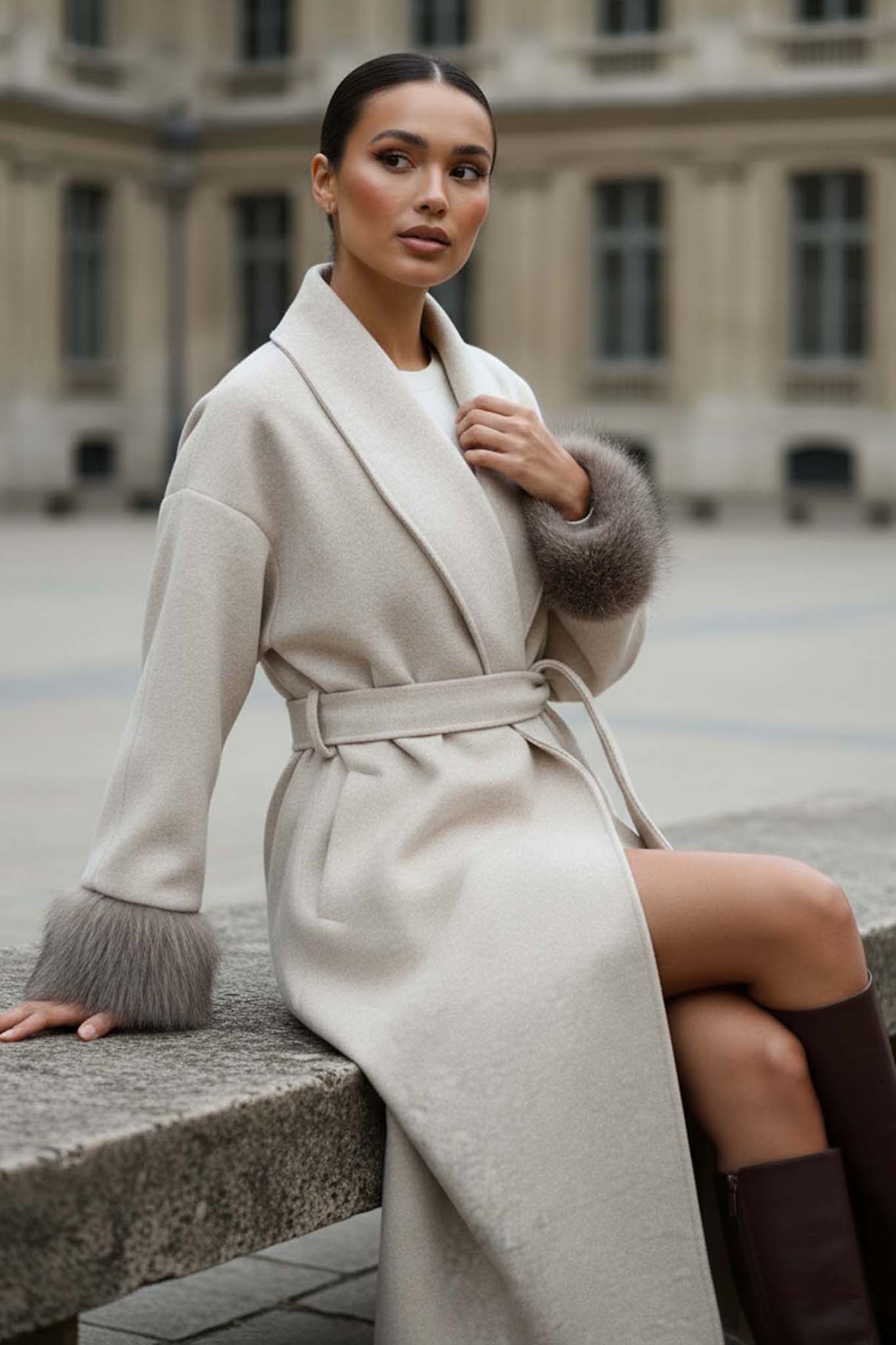 Μακρύ παλτό με γουνάκι στα μανίκια και ζωνάκι στη μέση.
