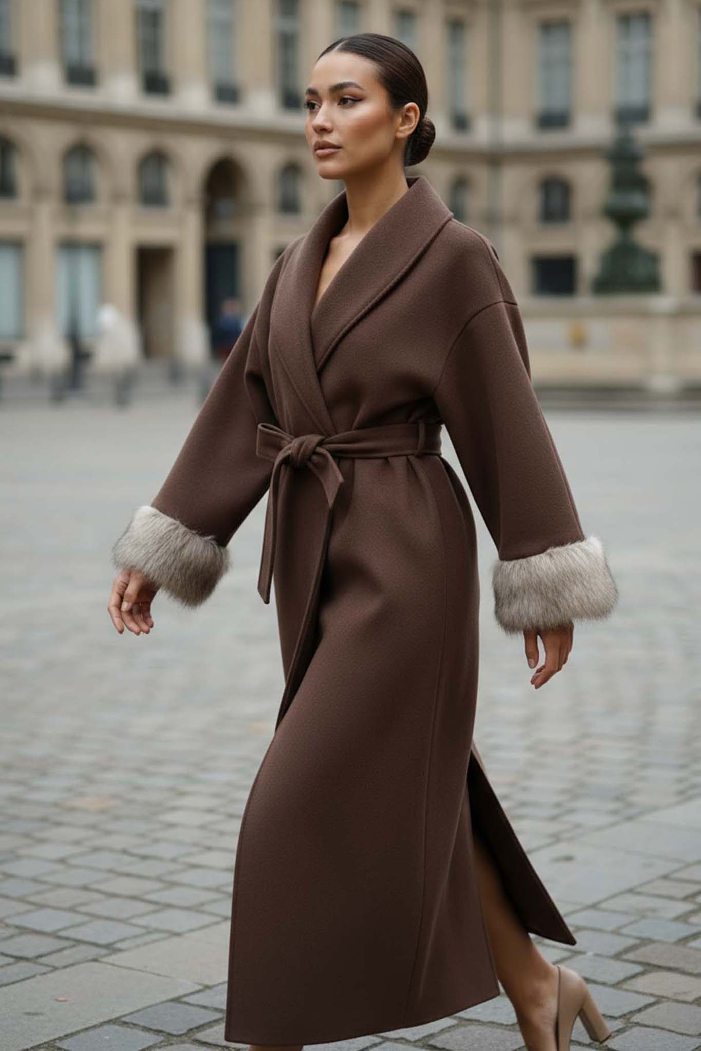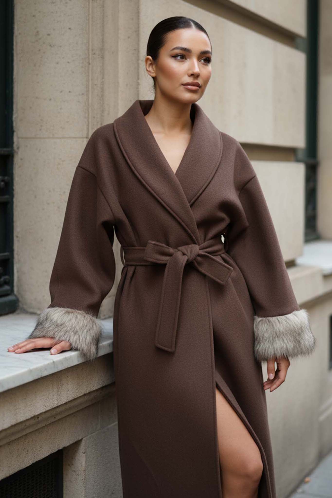 Μακρύ παλτό με γουνάκι στα μανίκια και ζωνάκι στη μέση.