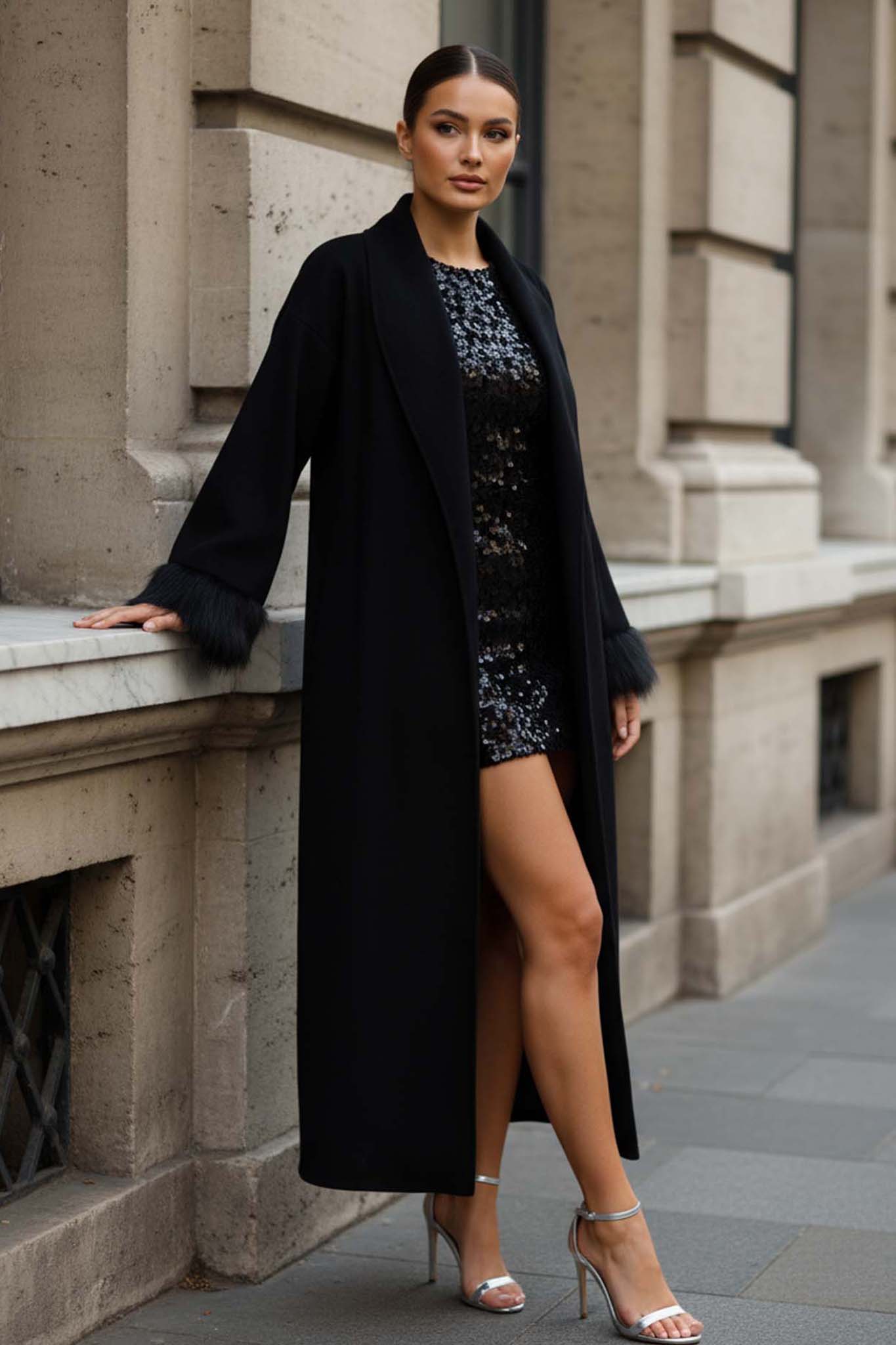 Μακρύ παλτό με γουνάκι στα μανίκια και ζωνάκι στη μέση.