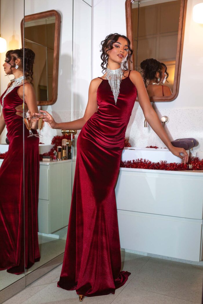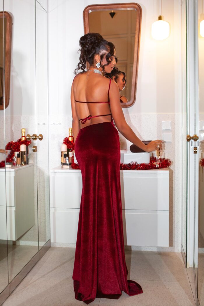 Φόρεμα μάξι βελούδινο, εφαρμόζει στο σώμα και κολακεύει. Εξώπλατο. Προσφέρει ένα γιορτινό και θηλυκό αποτέλεσμα. Ιδανικό για επίσημες,glam εμφανίσεις και red carpet moments. Το must have για τις φετινές γιορτές.