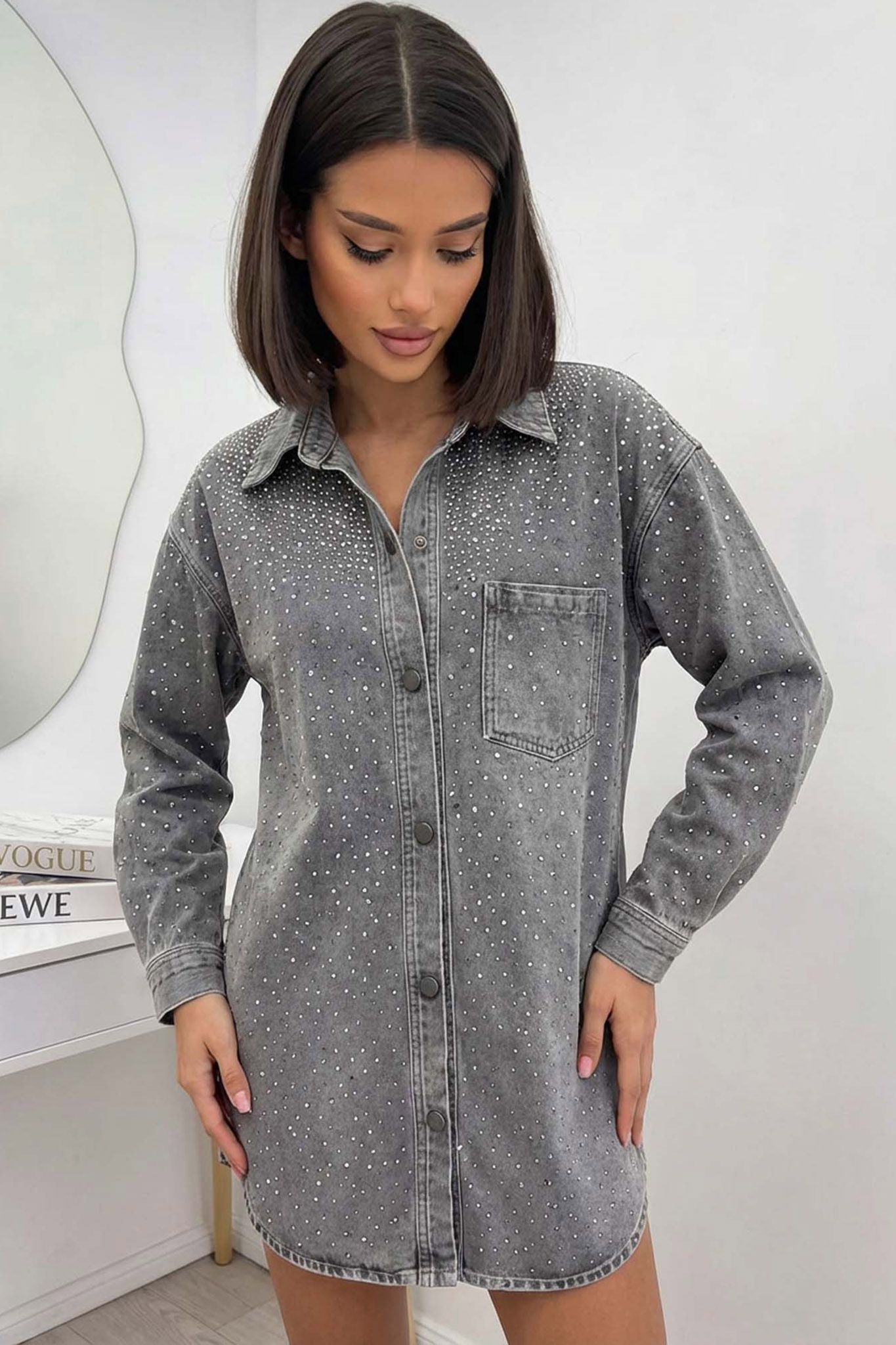 Oversized denim πουκάμισο το οποίο αποτελεί ένα εντυπωσιακό κομμάτι, καθώς συνδυάζει την άνεση της τζιν υφής με τη λάμψη από διάσπαρτα στρας που κοσμούν το μπροστινό μέρος. Διαθέτει κλασική γραμμή με γιακά, μεταλλικά κουμπιά και μια τσέπη στο στήθος.