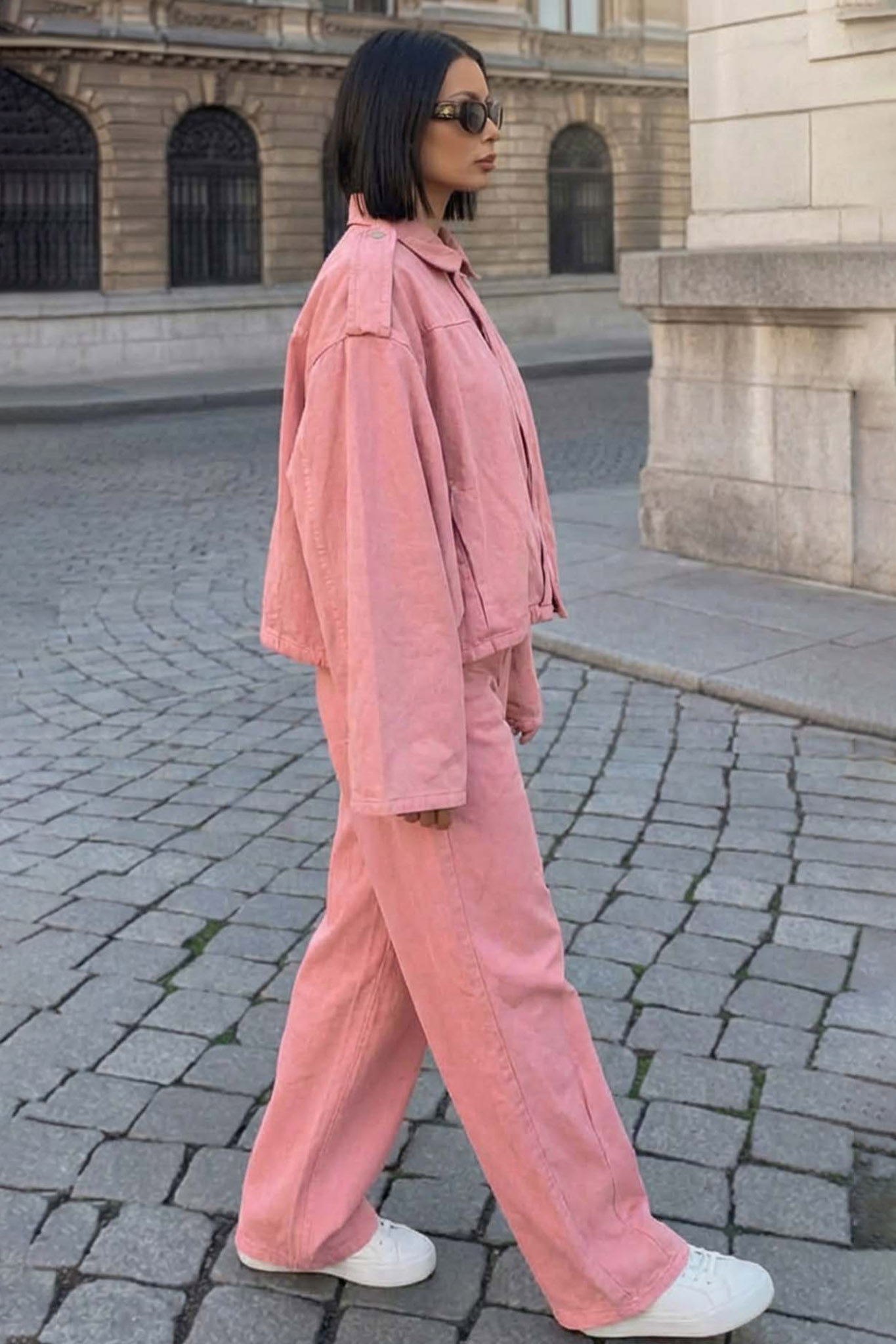 Σετ jacket με παντελόνι. Το jacket διαθέτει εξαιρετικά φαρδιά μανίκια και χαλαρή γραμμή (boxy fit), ενώ το wide-leg παντελόνι ολοκληρώνει τη σιλουέτα προσφέροντας άνεση και μοντέρνο αέρα.