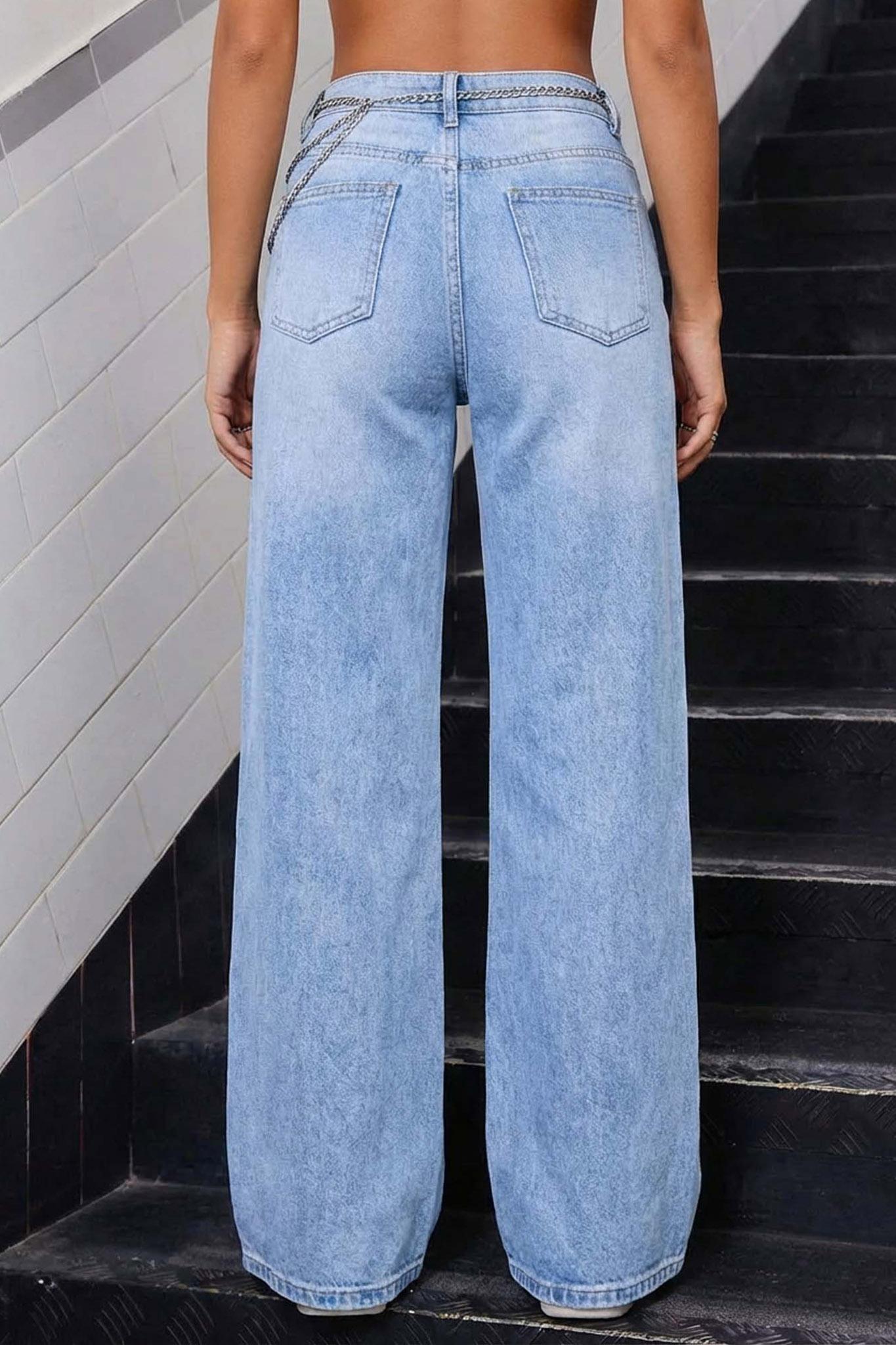 Ψηλόμεσο τζιν παντελόνι. Η wide leg (φαρδιά) γραμμή του προσφέρει μια αέρινη αίσθηση και ελευθερία κινήσεων, ενώ η ψηλή μέση τονίζει ιδανικά τη σιλουέτα.