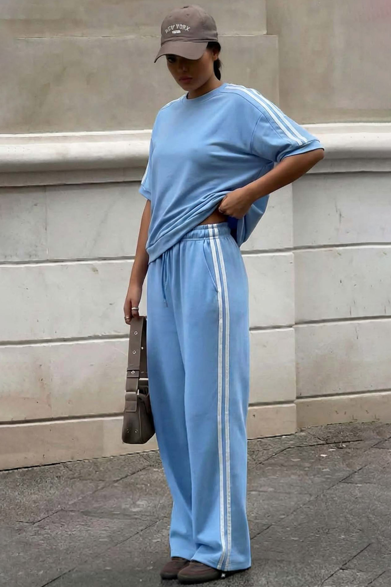Σετ μπλούζα παντελόνι που προσφέρει ένα ολοκληρωμένο athleisure look με ρίγα στο πλάι και κοντό μανίκι,ιδανικό για άνετες καθημερινές εμφανίσεις με στυλ.. Μπλούζα: μήκος 68cm, στήθος 140cm. Παντελόνι: μήκος 106cm, μέση 72cm