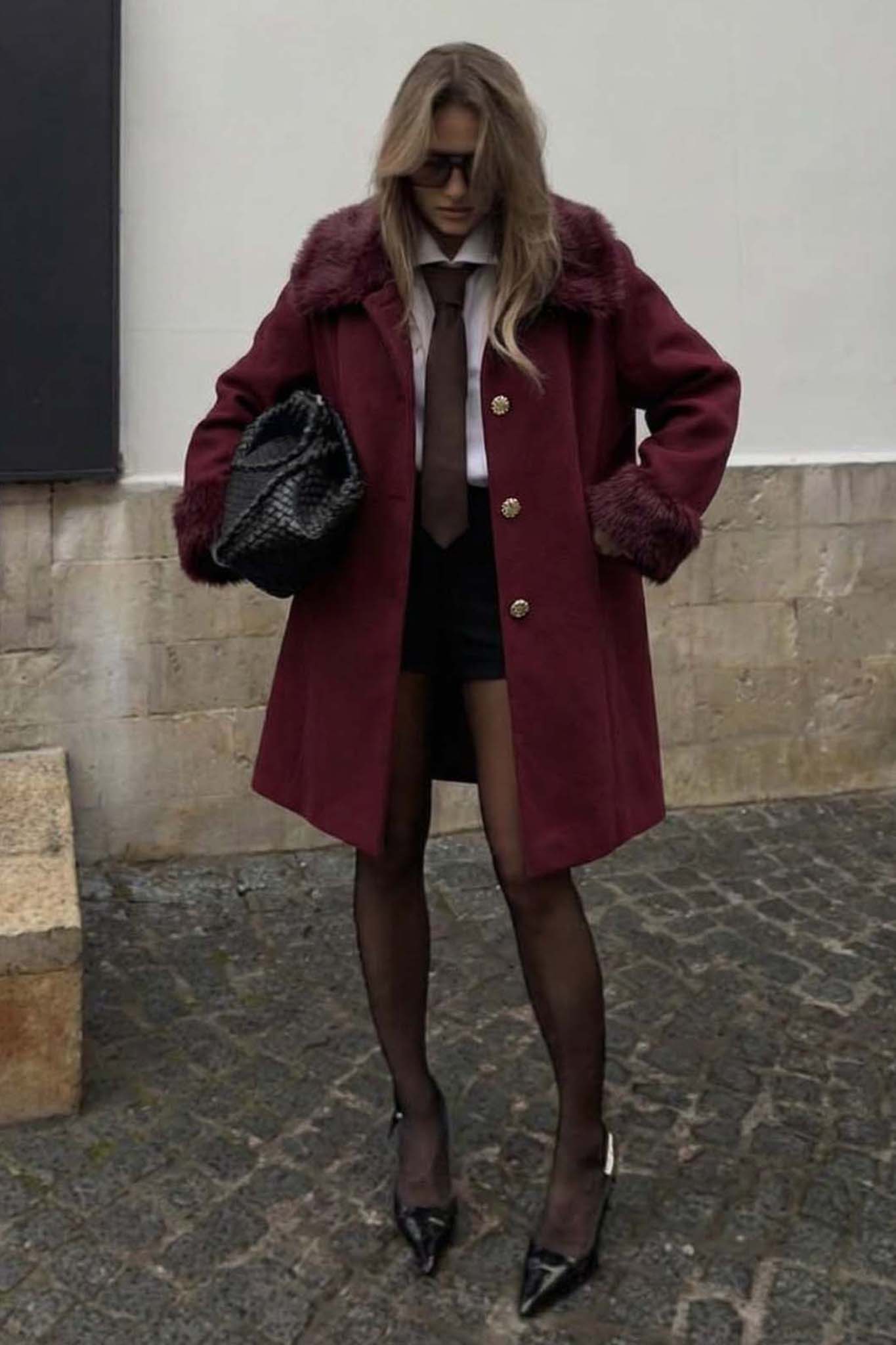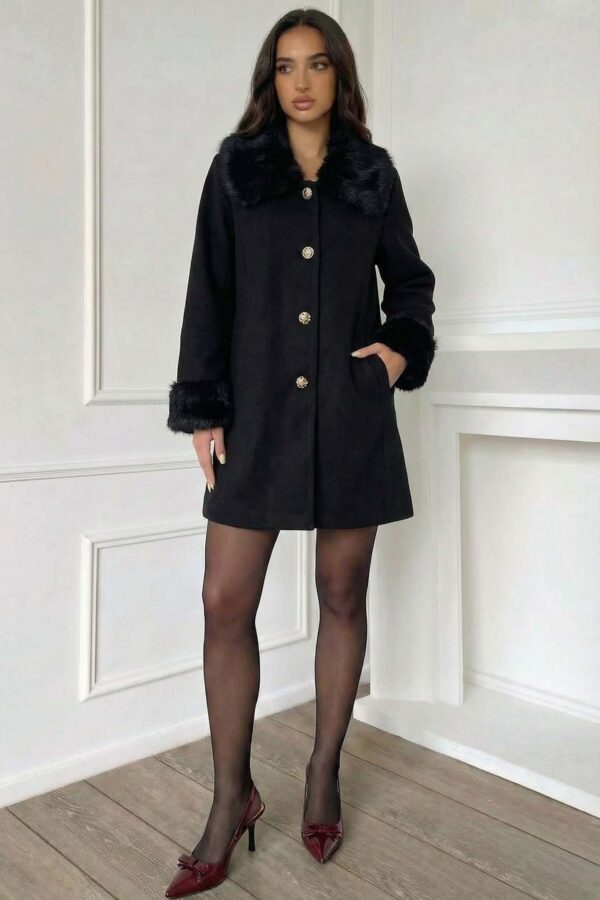 Παλτό μεσαίου ύψους, με οικολογική γούνα σε γιακά και μανίκια. Προσφέρει κομψό αποτέλεσμα. Ιδανική επιλογή για καθημερινές εμφανίσεις.