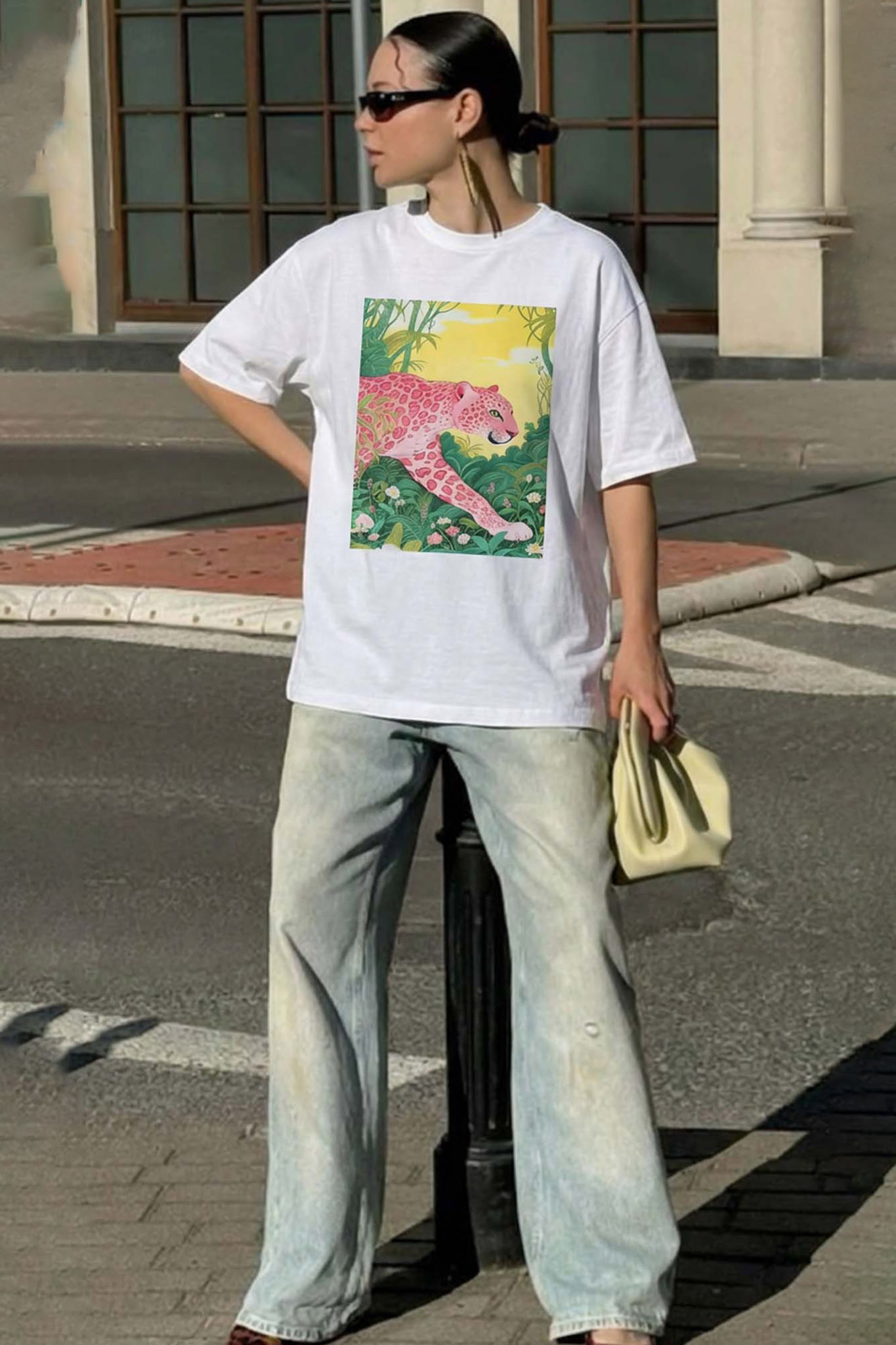 Λευκό oversized T-shirt από μαλακό βαμβακερό ύφασμα, ιδανικό για άνεση και στυλ σε κάθε περίσταση. Διαθέτει εντυπωσιακό εμπριμέ σχέδιο στο μπροστινό μέρος . Συνδυάζεται εύκολα με τζιν, σορτς ή κολάν για casual εμφανίσεις με προσωπικότητα.