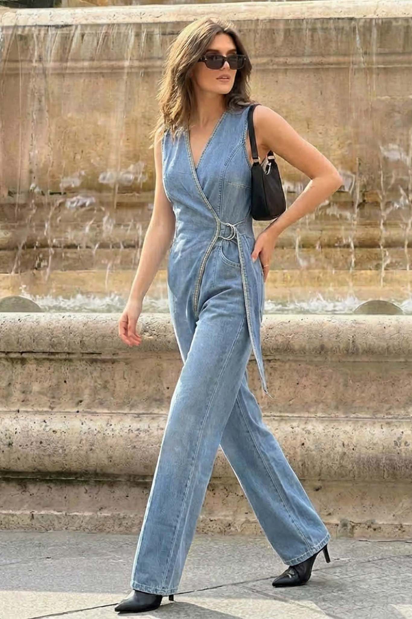 Μοντέρνα αμάνικη ολόσωμη φόρμα με κομψό κρουαζέ σχέδιο και μεταλλικό κρίκο στη μέση για τέλεια εφαρμογή. Διαθέτει φαρδιά γραμμή στα πόδια για άνεση και στυλ, ενώ το ελαφρύ τζιν ύφασμα προσφέρει ευκολία στην κίνηση και καθημερινή κομψότητα. Ιδανική επιλογή για casual αλλά και πιο προσεγμένες εμφανίσεις.