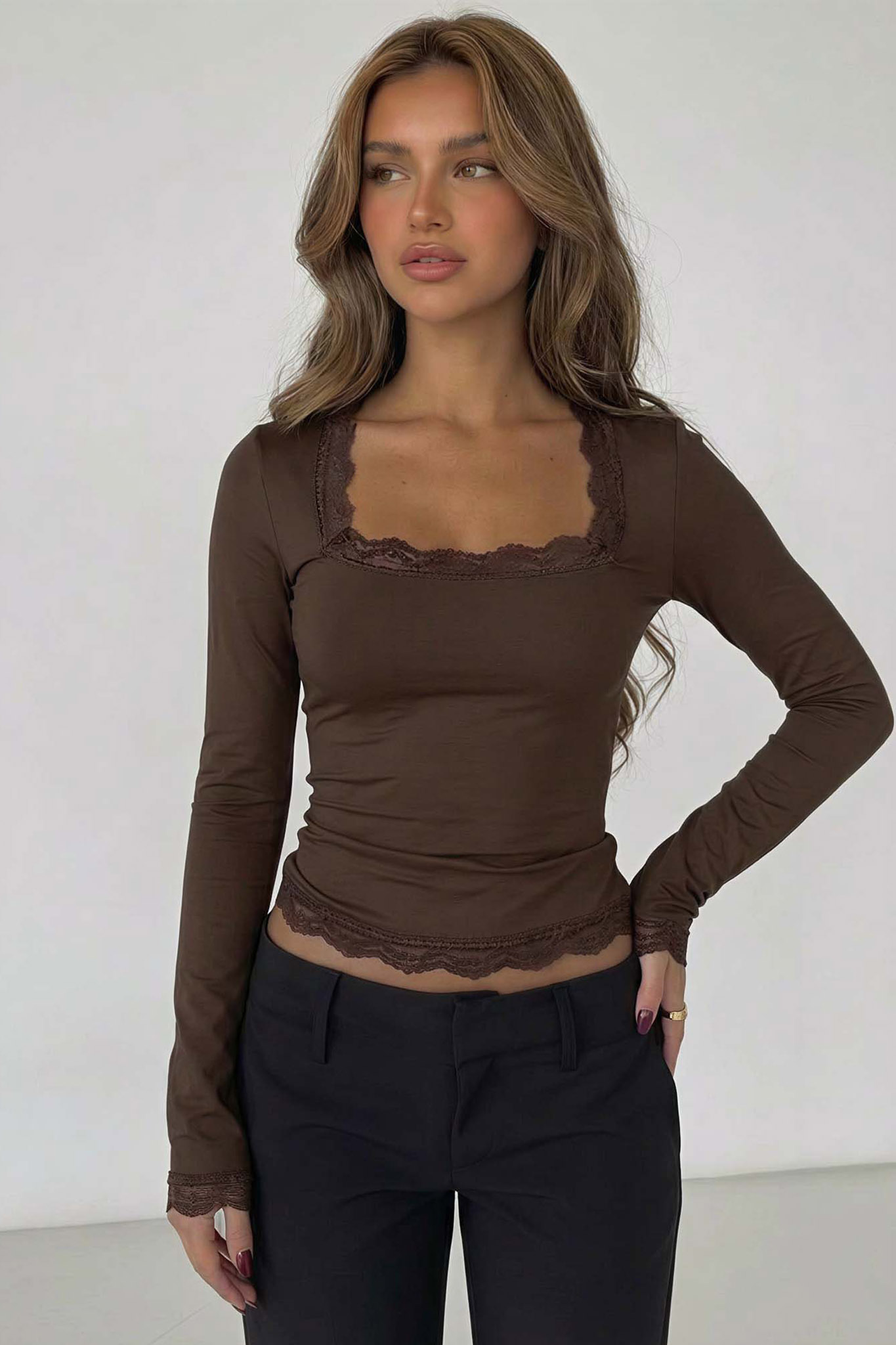Μακρυμάνικη μπλούζα με τετράγωνη λαιμόκοψη και ρομαντικές λεπτομέρειες από δαντέλα.