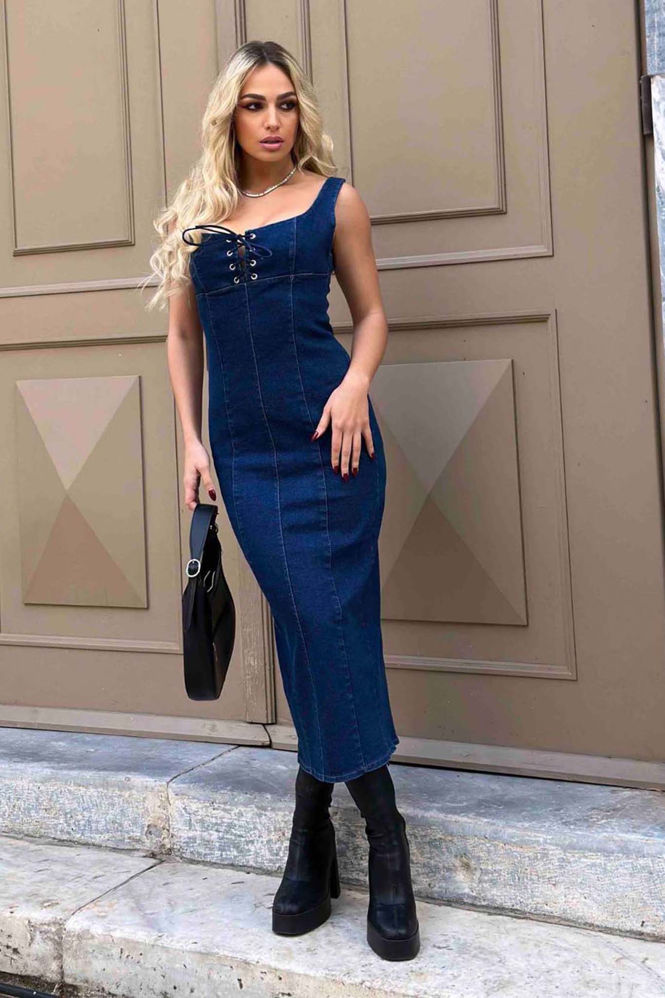 Μίντι φόρεμα τζιν με τιράντες και δέσιμο με κορδόνι στο ντεκολτέ.