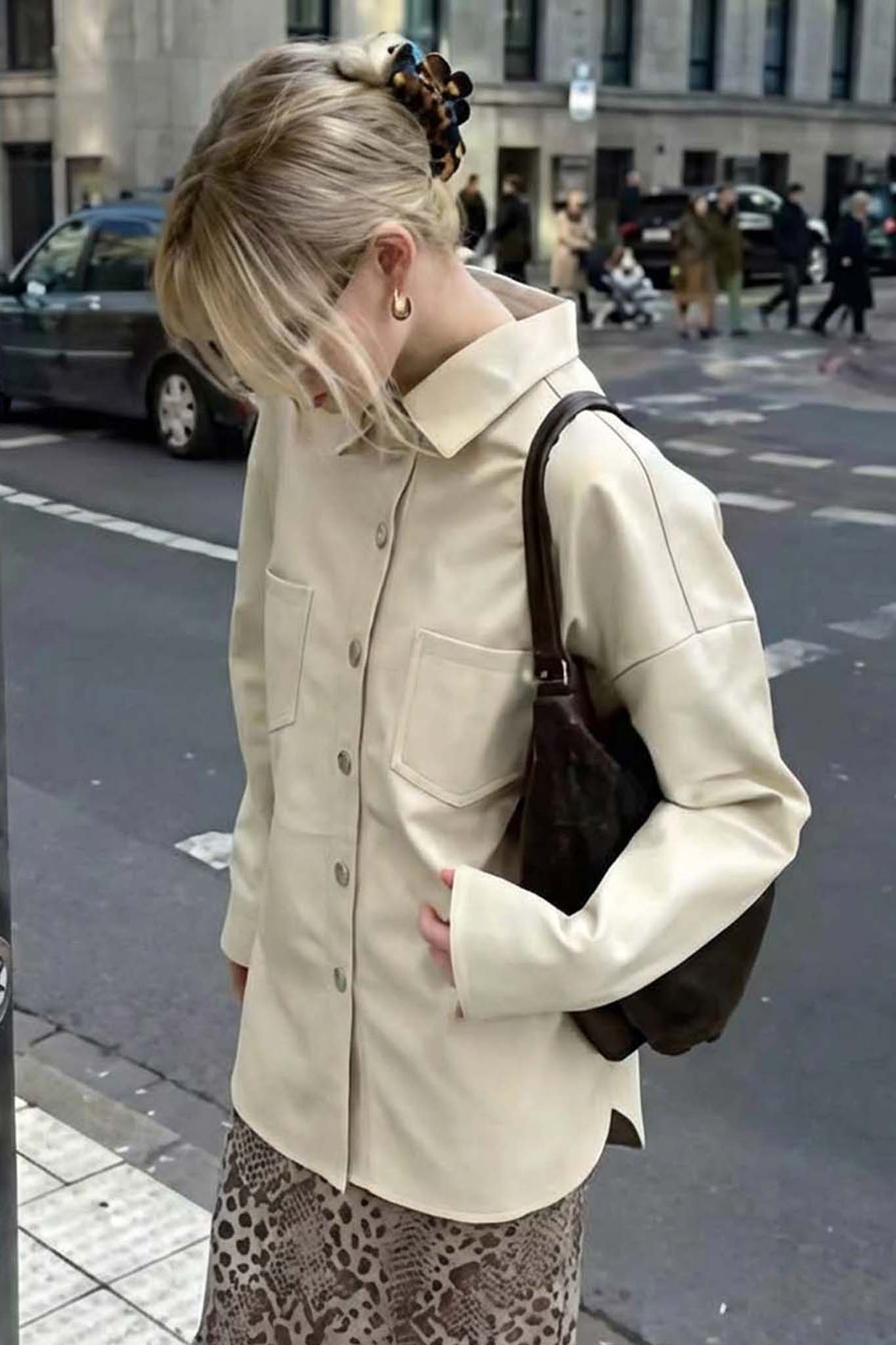 Τζάκετ σρ στυλ πουκάμισου, κατασκευασμένο από απαλή οικολογική δερματίνη (faux leather), προσφέρει μια πολυτελή αίσθηση με ματ φινίρισμα. Η χαλαρή, oversized γραμμή του το καθιστά ευκολοφόρετο με παντελόνια ή φορέματα, για ένα ολοκληρωμένο και ενημερωμένο look.