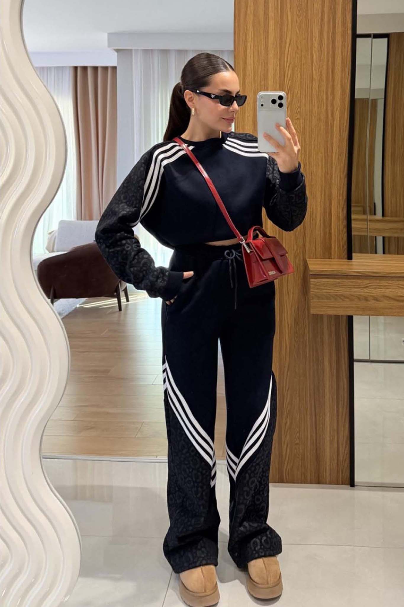 Σετ φούτερ, αποτελείται από μπλούζα και παντελόνι. Εντυπωσιακός σχεδιασμός με ρίγα και λέοπαρ print. ’νετη εφαρμογή. Ιδανική επιλογή για καθημερινές εμφανίσεις.