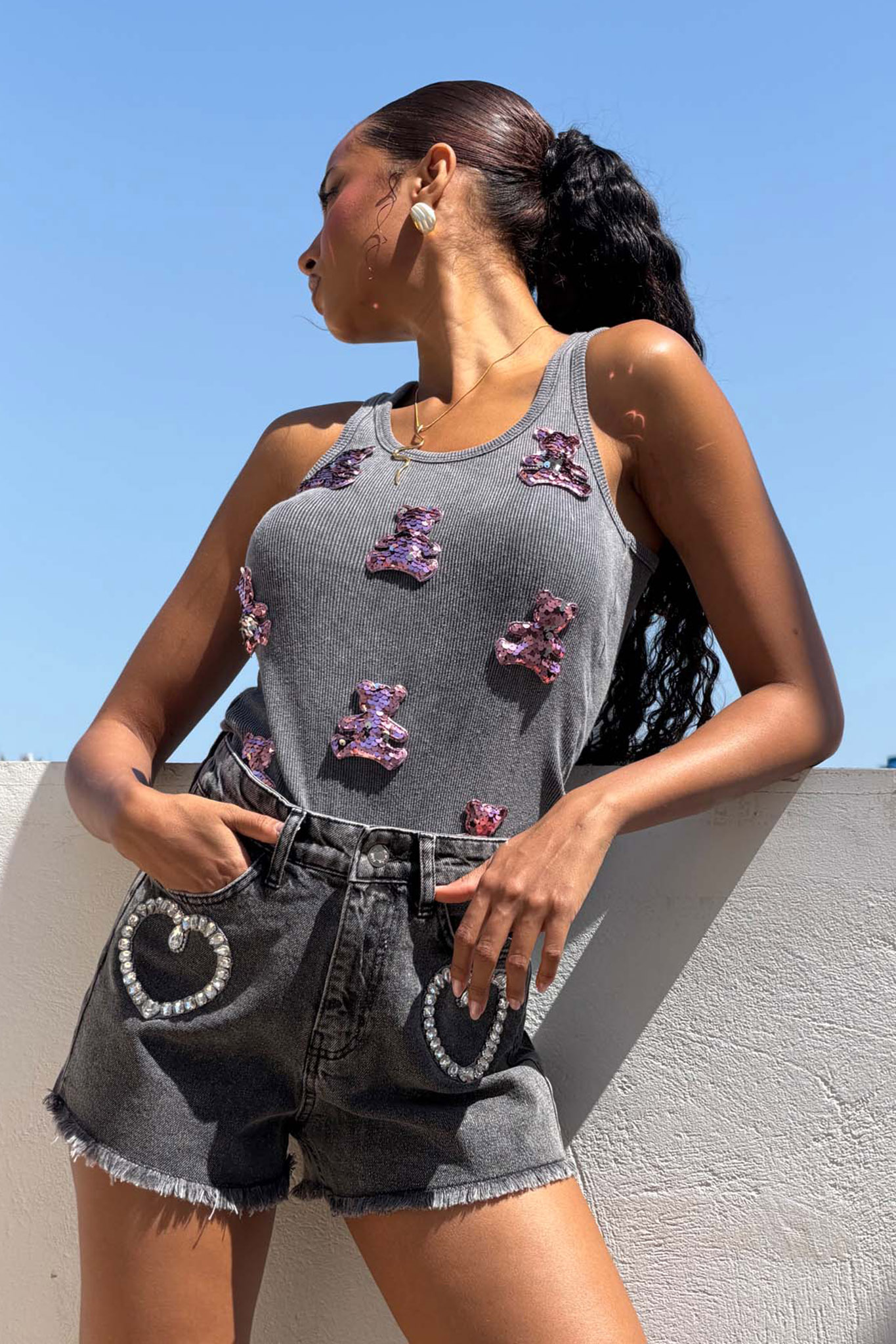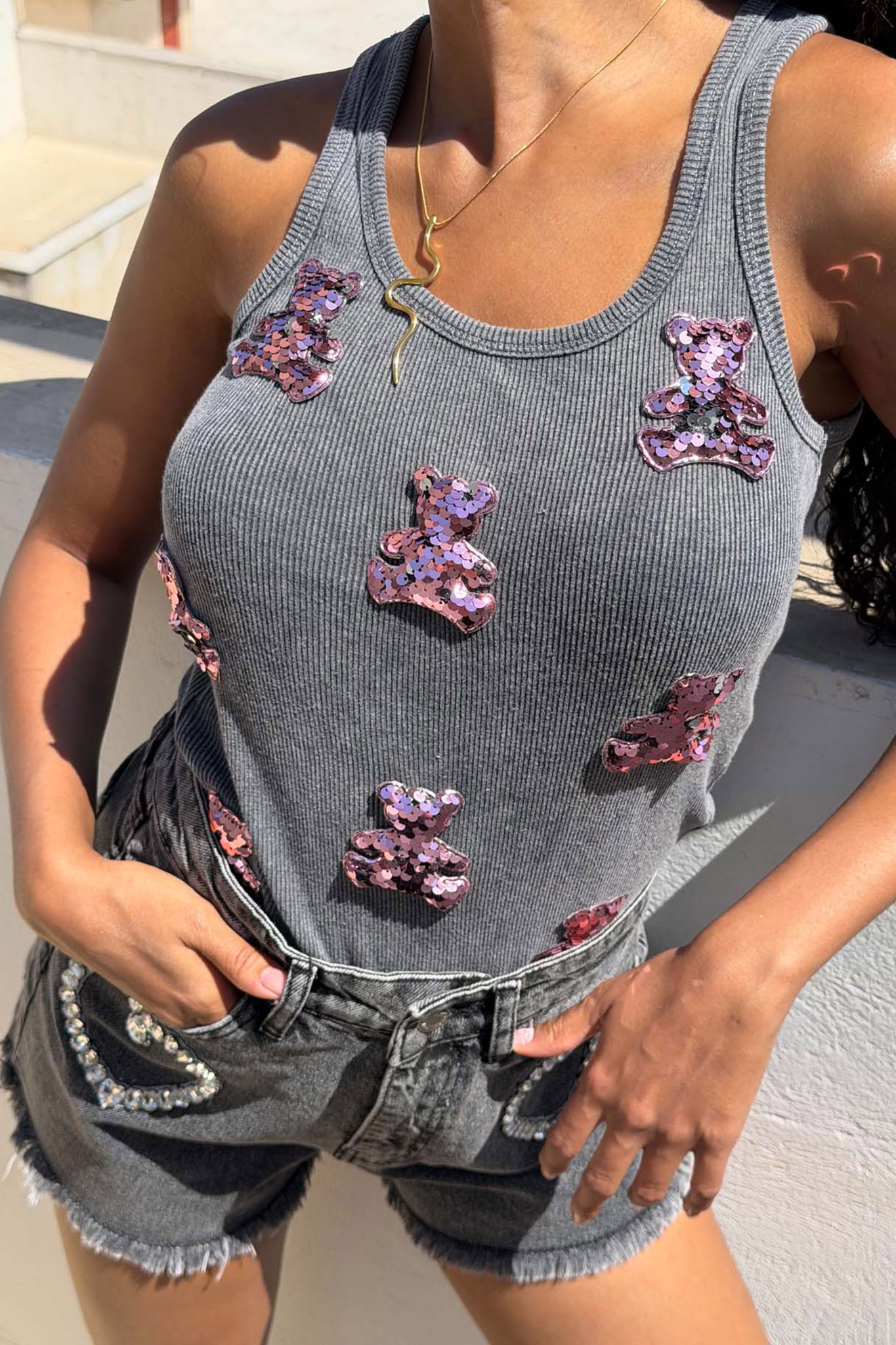 Μοντέρνο ριπ τοπ με χαριτωμένες teddy λεπτομέρειες από παγιέτες που δίνουν playful και ταυτόχρονα glam χαρακτήρα. Η εφαρμοστή γραμμή αγκαλιάζει το σώμα, ενώ το ελαστικό ύφασμα προσφέρει άνεση όλη μέρα. Ιδανική επιλογή για casual chic εμφανίσεις με denim σορτσάκια ή jeans.