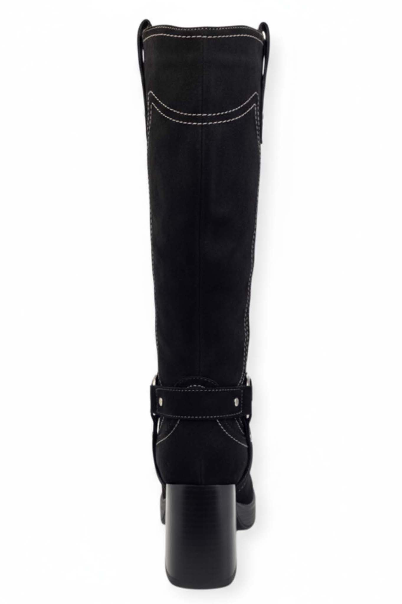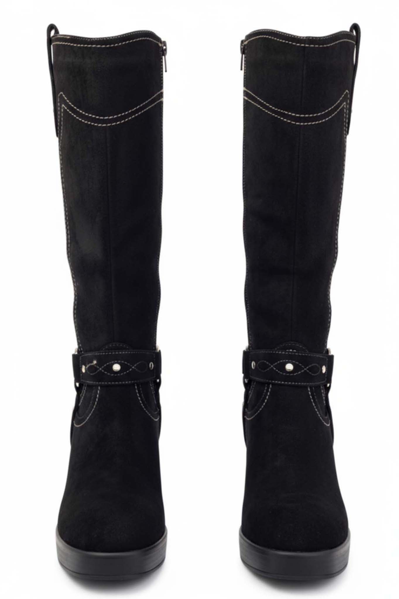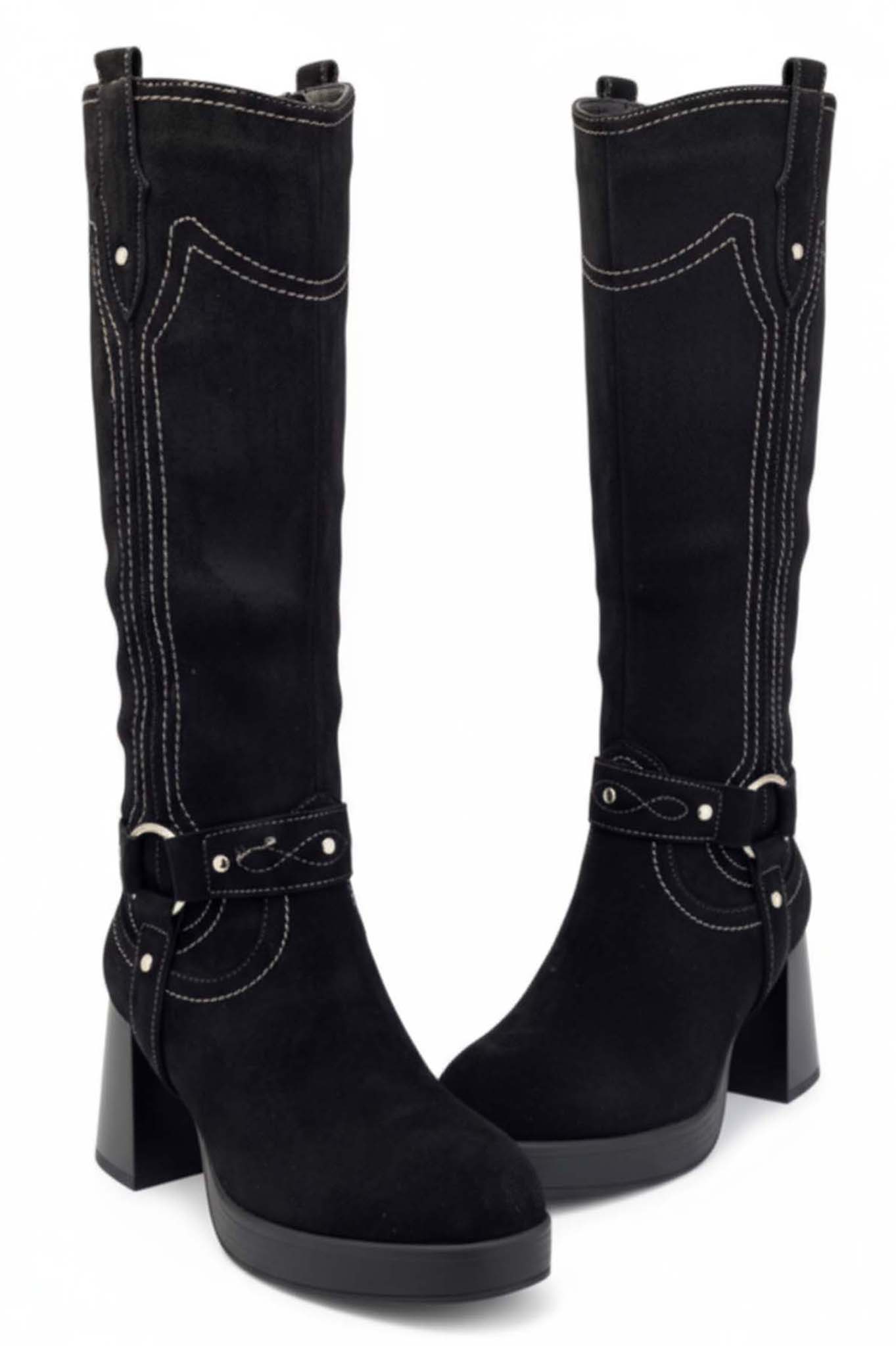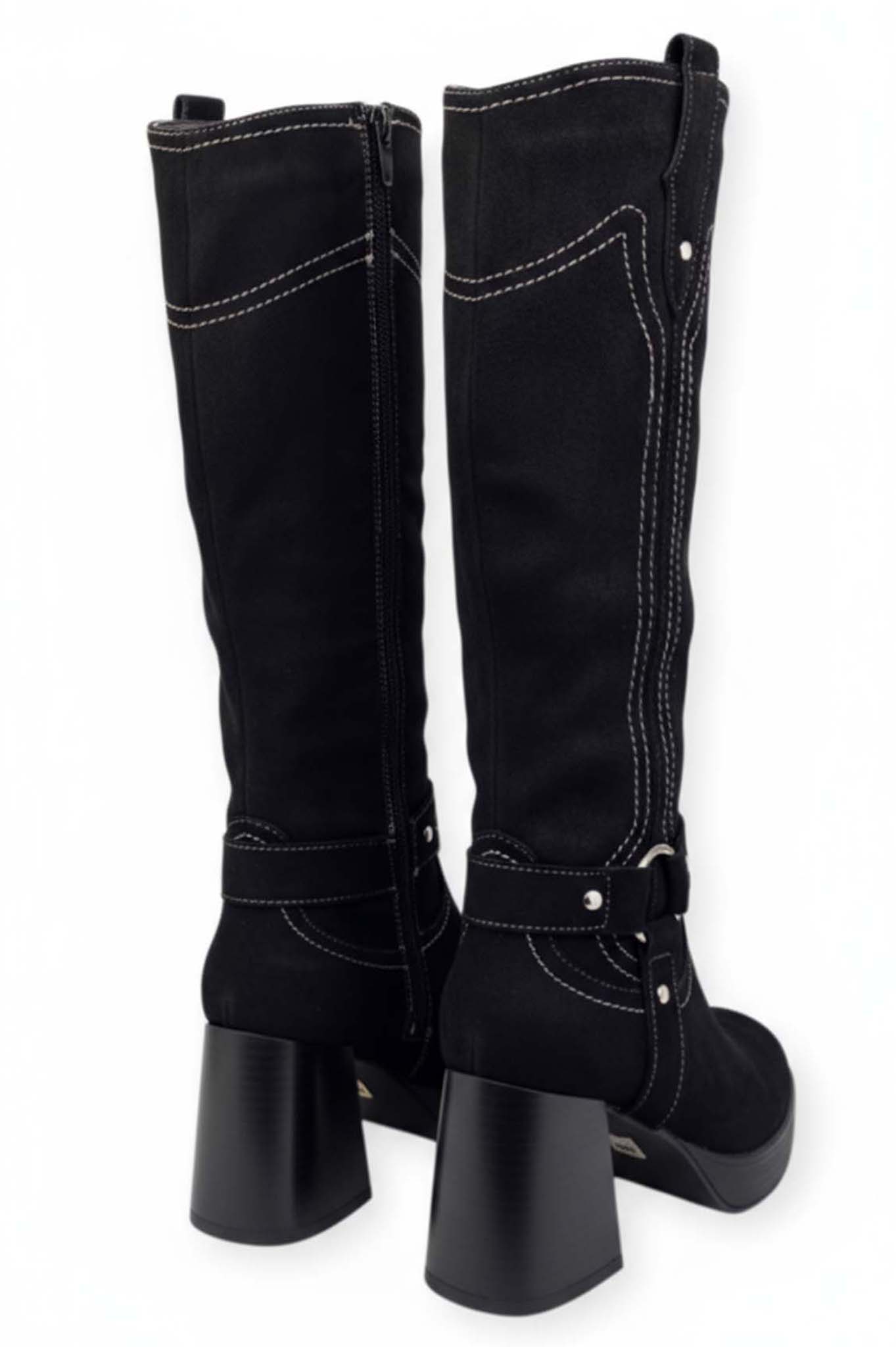 Μπότες ψηλές με ασημί λεπτομέρειες και μεσσαίου μεγέθους τακούνι, στρογγυλή μύτη.