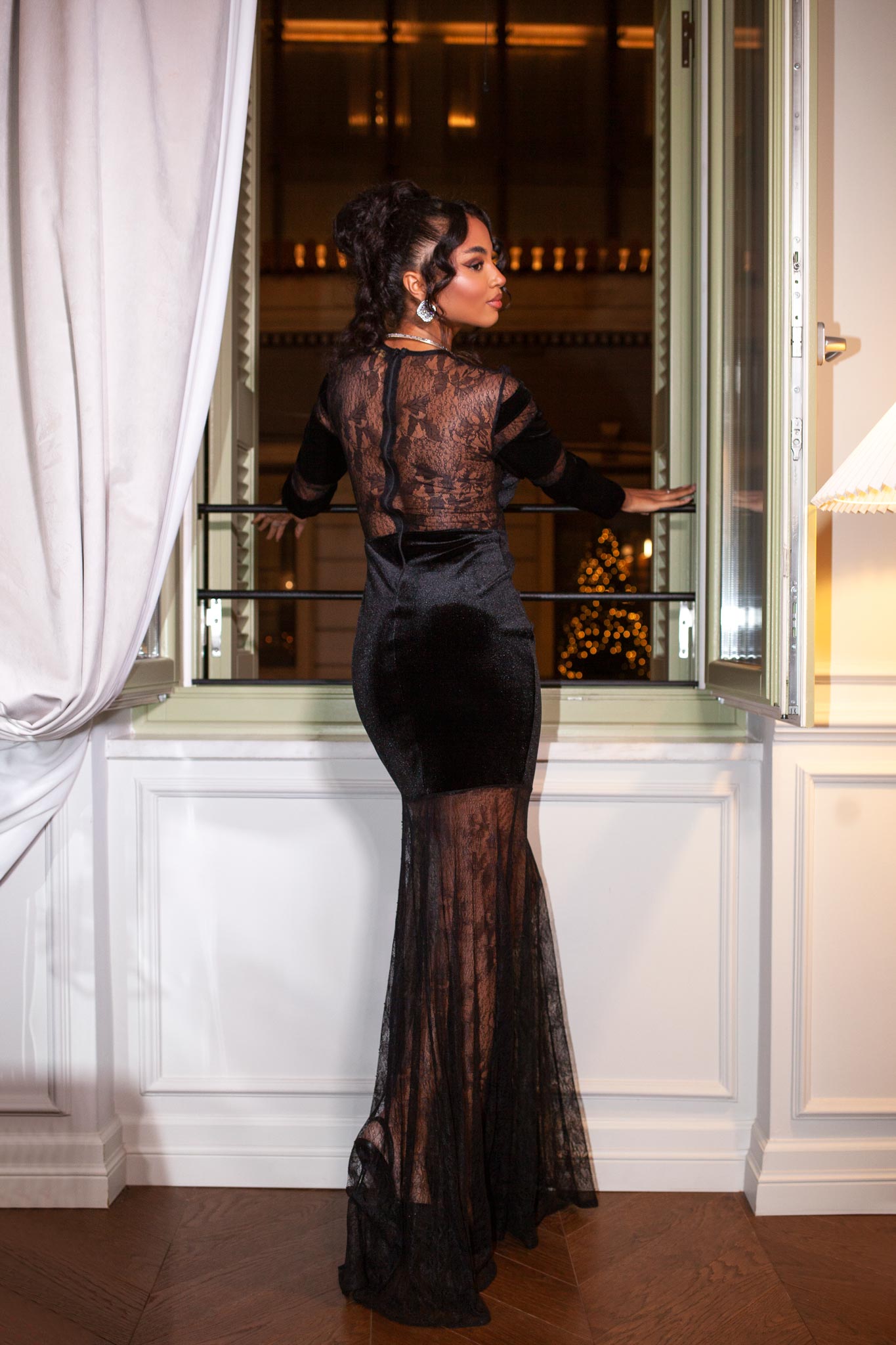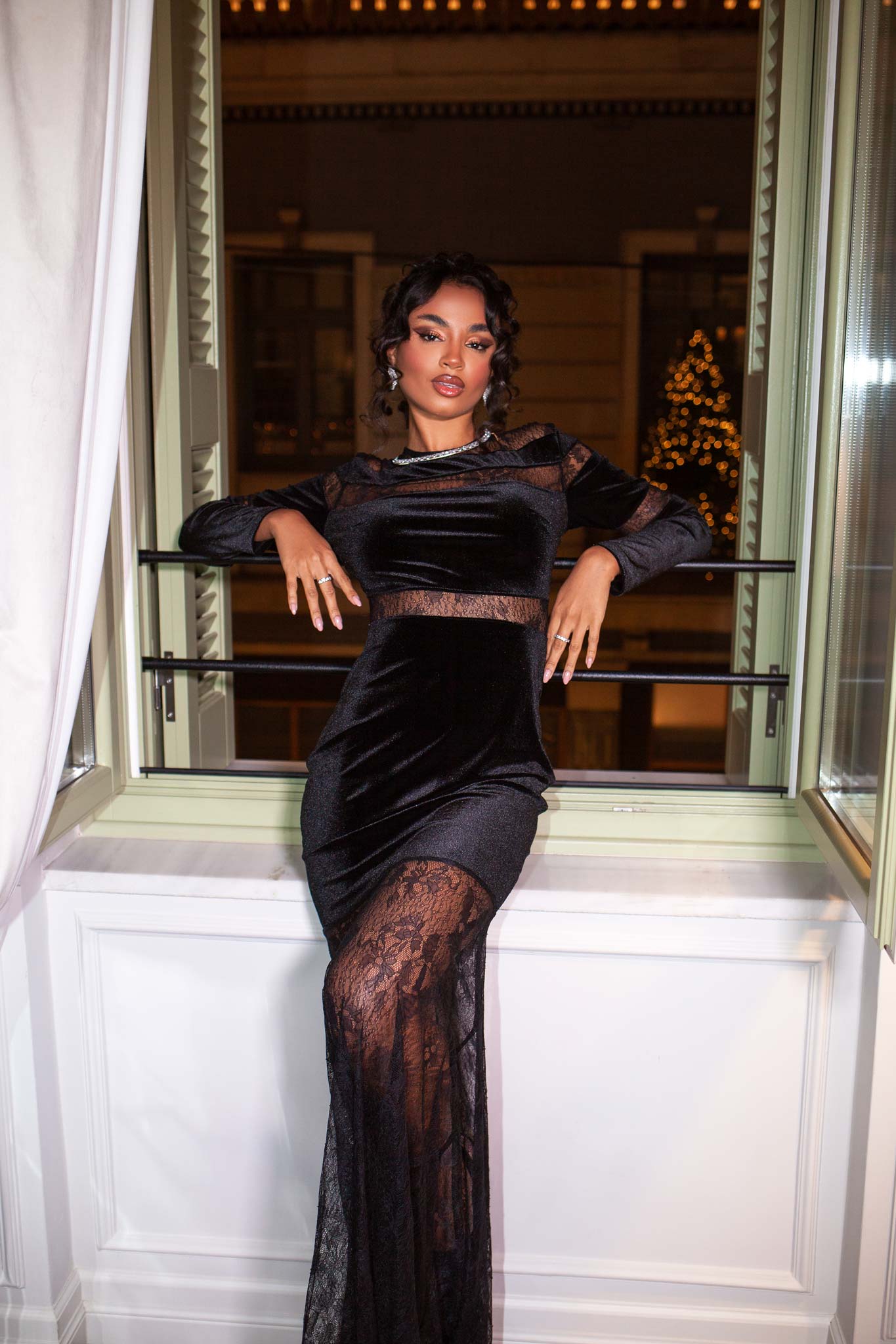 Φόρεμα βελούδινο σε μάξι γραμμή με δαντέλα που επιτρέπει να φαίνεται διακριτικά το δέρμα. Εφαρμοστό πάνω μέρος και άνοιγμα στο τελείωμα. Προσφέρει ένα εκκεντρικό αποτέλεσμα. Ιδανικό για glam βραδινές εμφανίσεις.