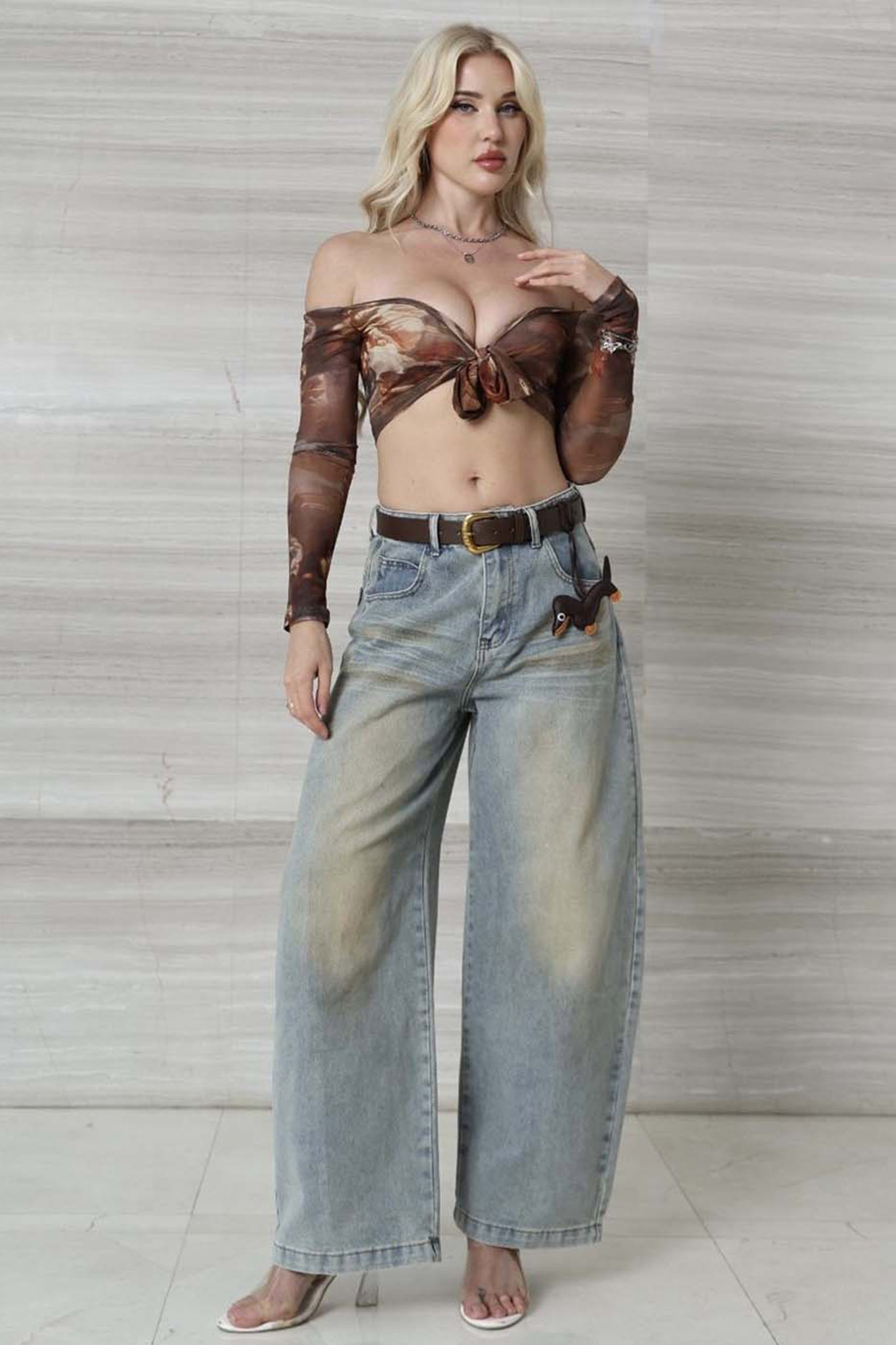 Τζιν παντελόνι ελαστικό με ζωνάκι και διακοσμητικό σχέδιο.