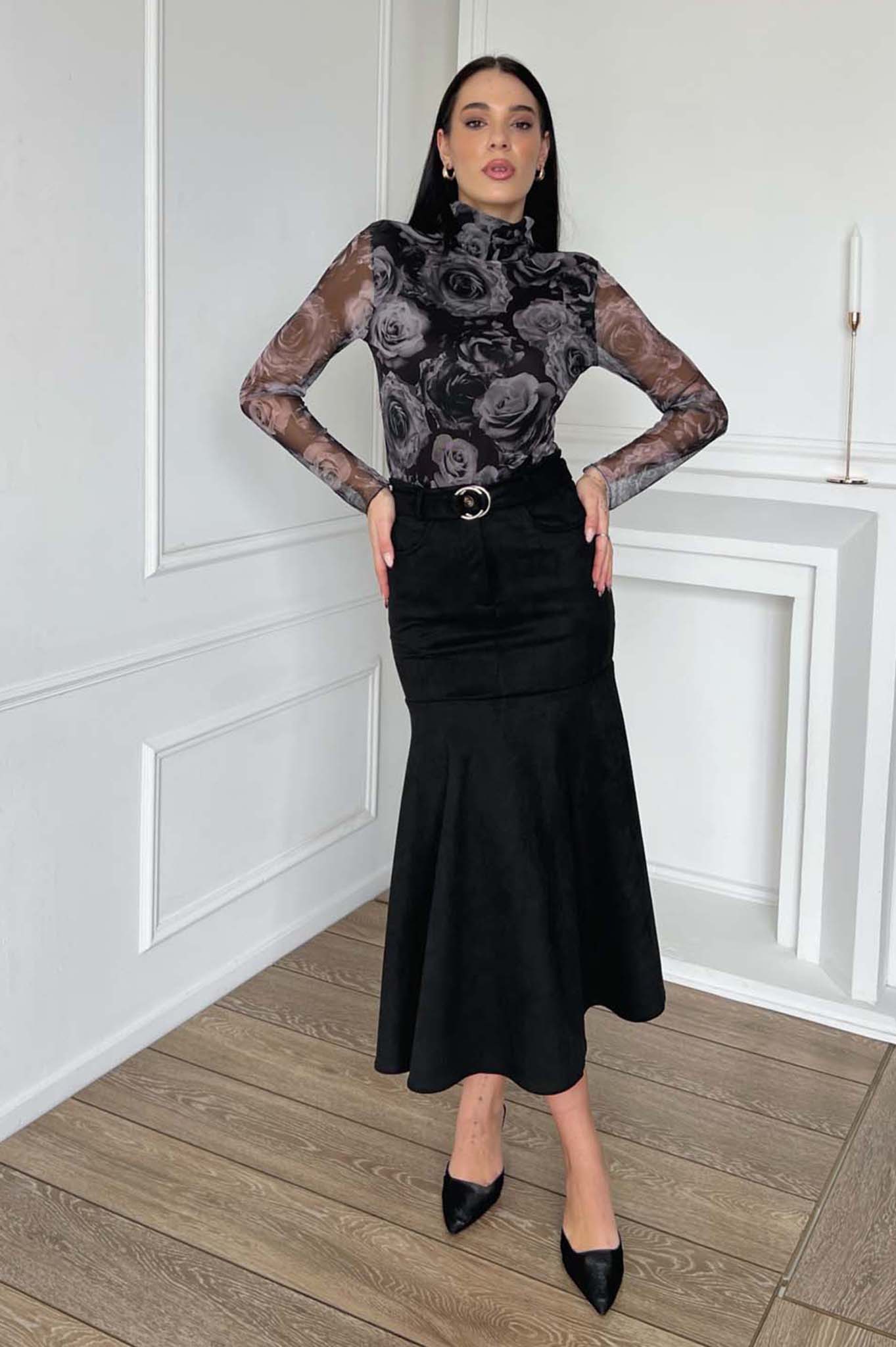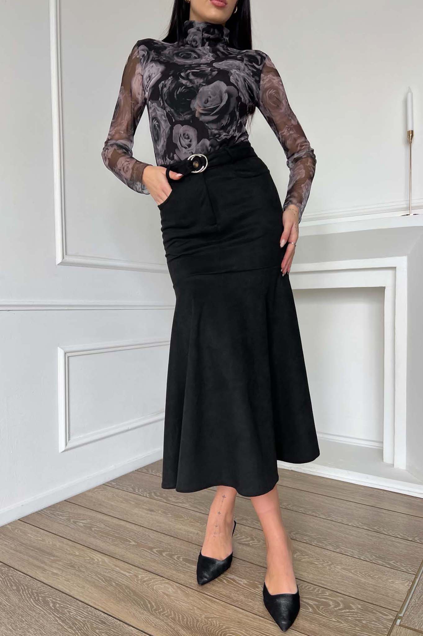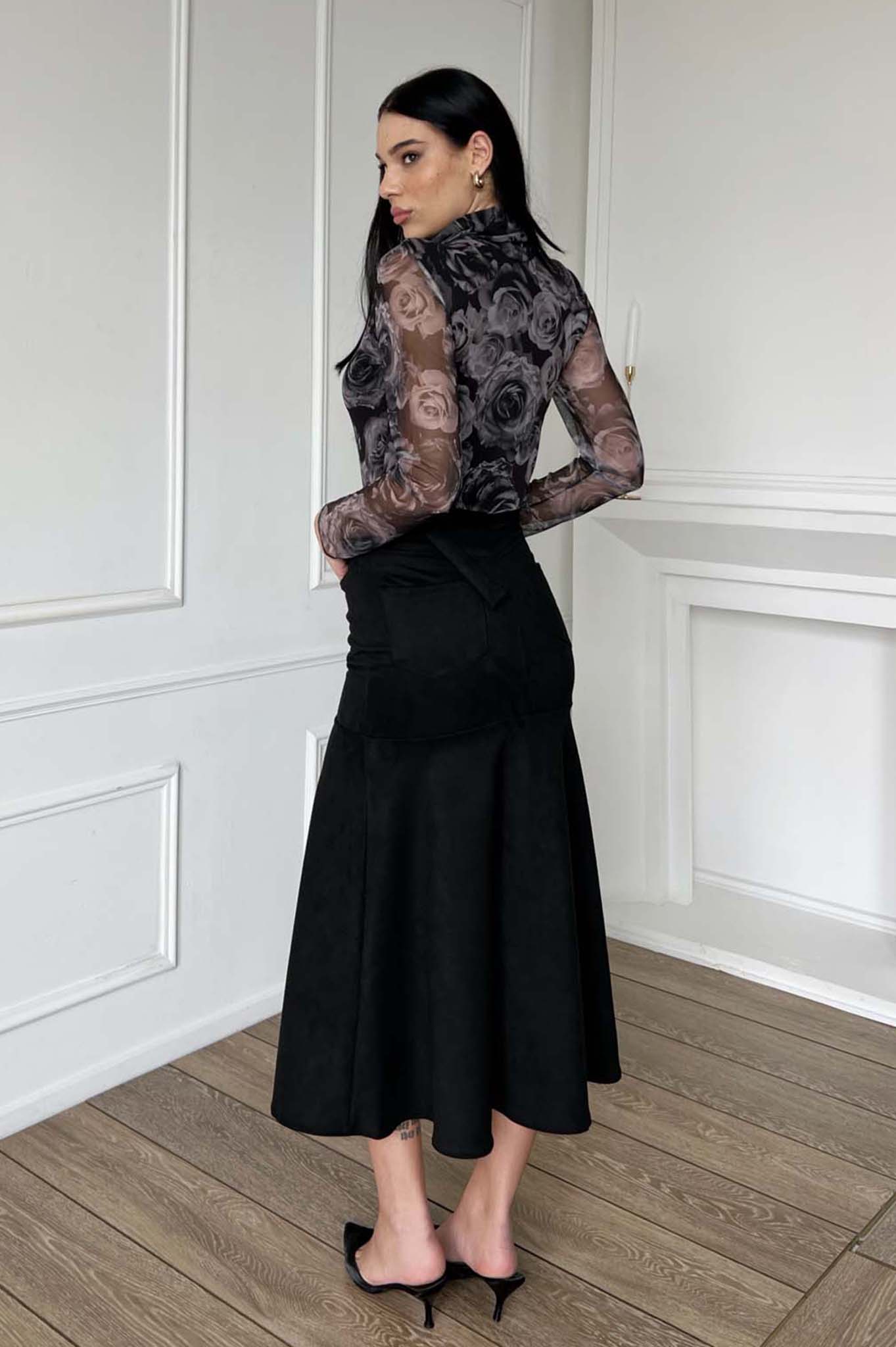 Μάξι φούστα σε ελαφριά καμπάνα γραμμή με διακριτική ζώνη στη μέση και κλασικές ραφές. Κομψό κομμάτι που αναδεικνύει τη σιλουέτα, ιδανικό για elegant office look ή βραδινές εμφανίσεις. Συνδυάζεται εύκολα με μπότες και πουκάμισα για chic αποτέλεσμα