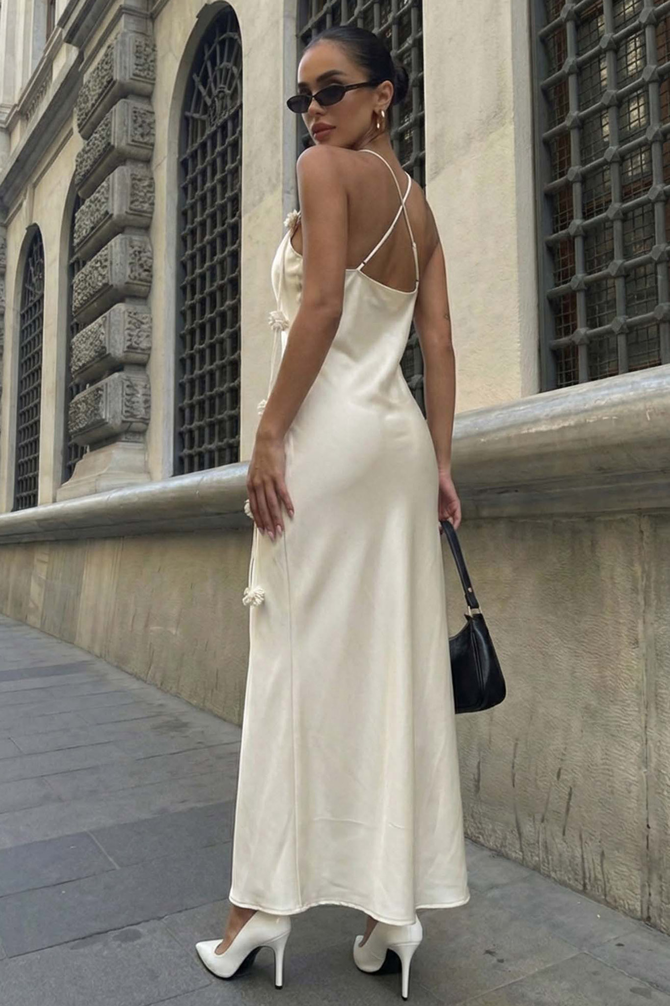 Μίντι σατέν φόρεμα με χιαστί πλάτη και διακοσμητικά λουλούδια! Ιδανικό για ιδιαίτερες περιστάσεις όπως γάμος, βάφτιση!