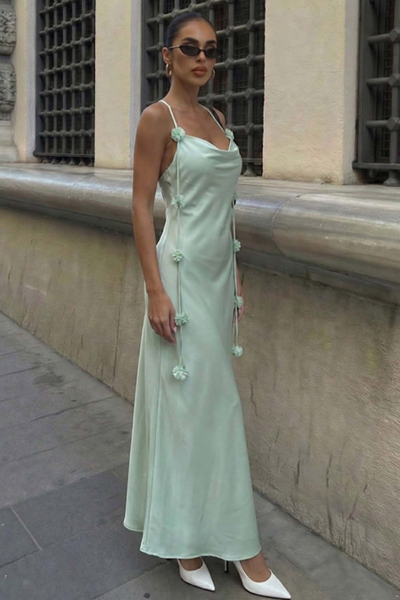 Μίντι σατέν φόρεμα με χιαστί πλάτη και διακοσμητικά λουλούδια! Ιδανικό για ιδιαίτερες περιστάσεις όπως γάμος, βάφτιση!