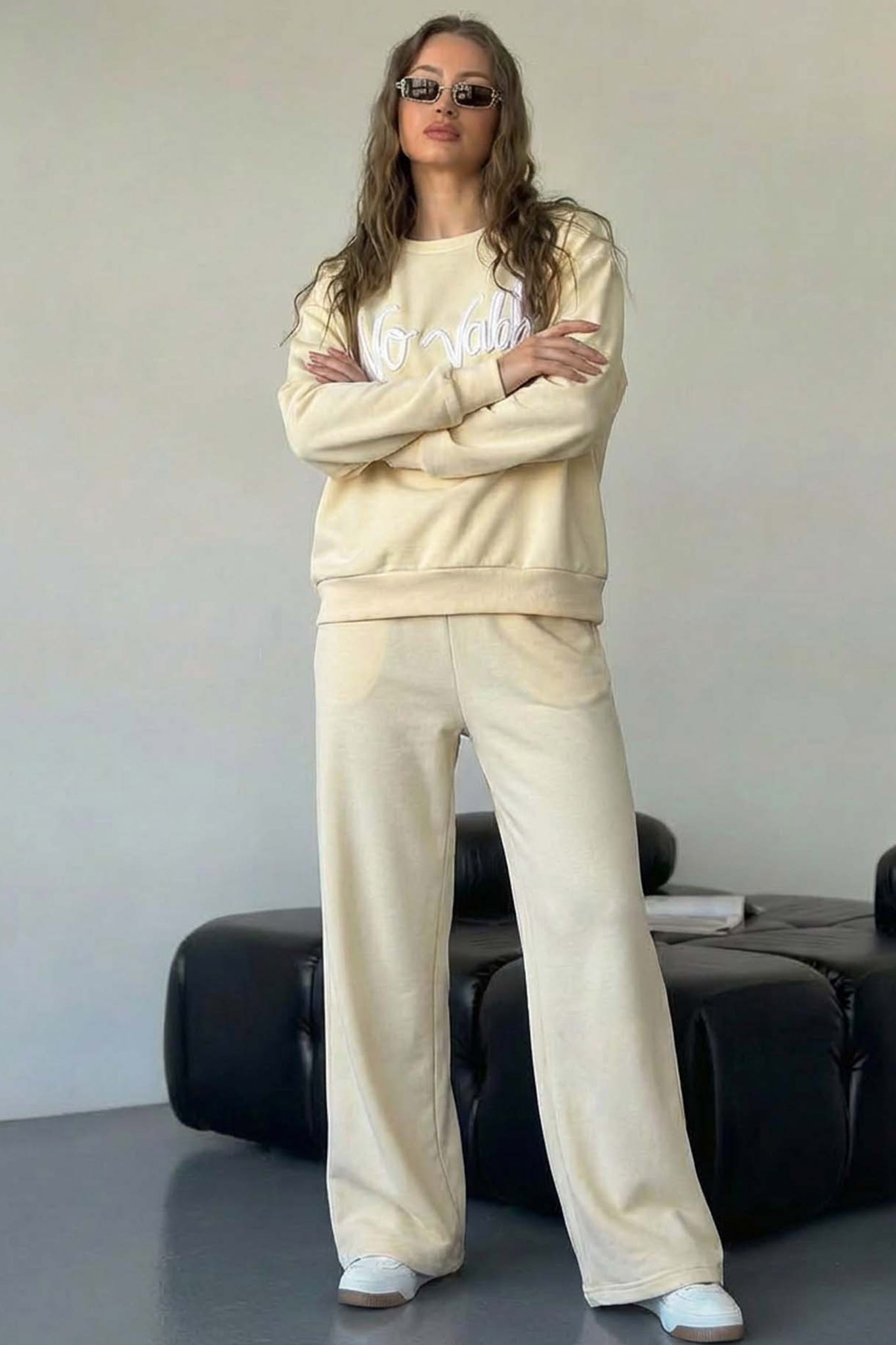 Σετ το οποίο διαθέτει oversized φούτερ με κέντημα “No Vibes” και ψηλόμεσο παντελόνι σε wide-leg γραμμή, προσφέροντας μια χαλαρή αλλά απόλυτα προσεγμένη σιλουέτα. Ιδανική επιλογή για cool casual εμφανίσεις που ξεχωρίζουν.