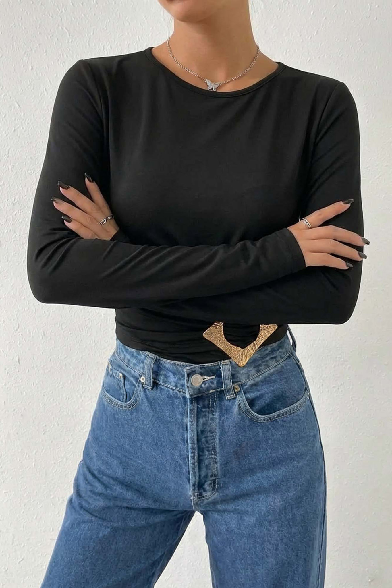 Μακρυμάνικη μπλούζα, slim fit με χρυσή λεπτομέρεια που ξεχωρίζει για elegant και chic εμφανίσεις. Μήκος 50cm, στήθος 40cm, μανίκι 60cm.