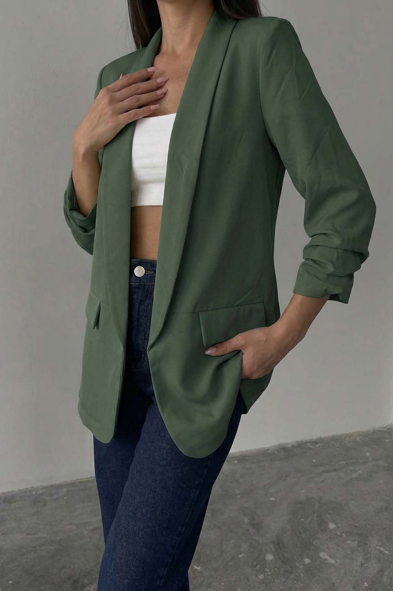 Σακάκι Blazer με Σούρα στα Μανίκια. Διαθέτει ανοιχτό μπροστινό μέρος χωρίς κουμπιά για ένα πιο χαλαρό στυλ.