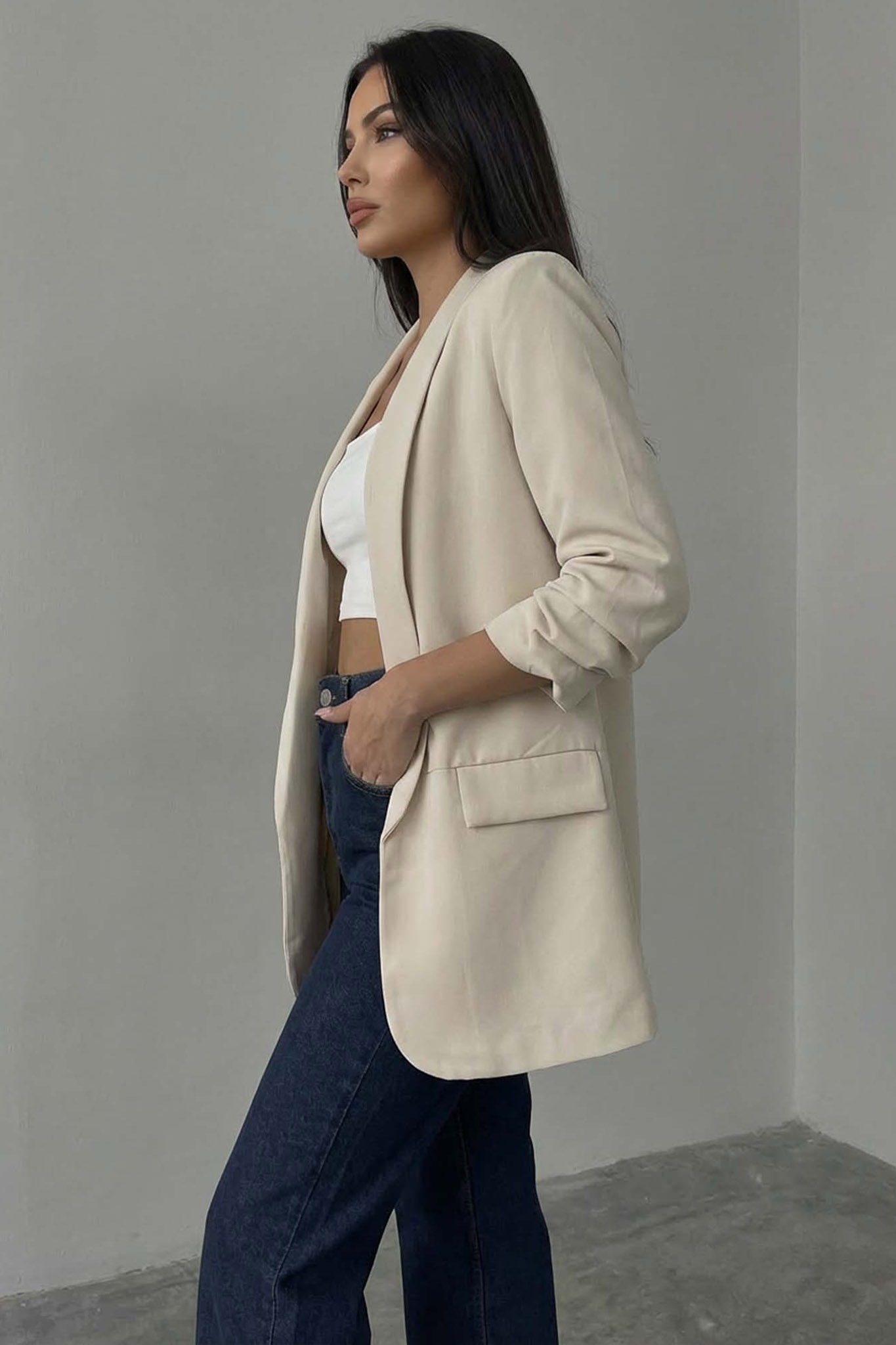 Σακάκι Blazer με Σούρα στα Μανίκια. Διαθέτει ανοιχτό μπροστινό μέρος χωρίς κουμπιά για ένα πιο χαλαρό στυλ.