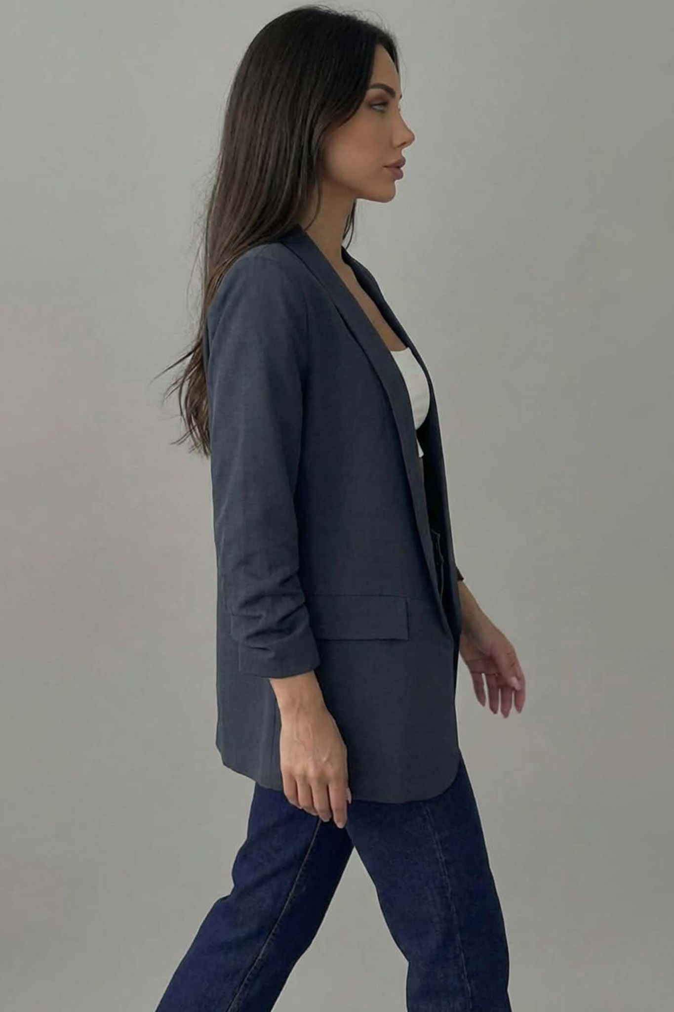 Σακάκι Blazer με Σούρα στα Μανίκια. Διαθέτει ανοιχτό μπροστινό μέρος χωρίς κουμπιά για ένα πιο χαλαρό στυλ.