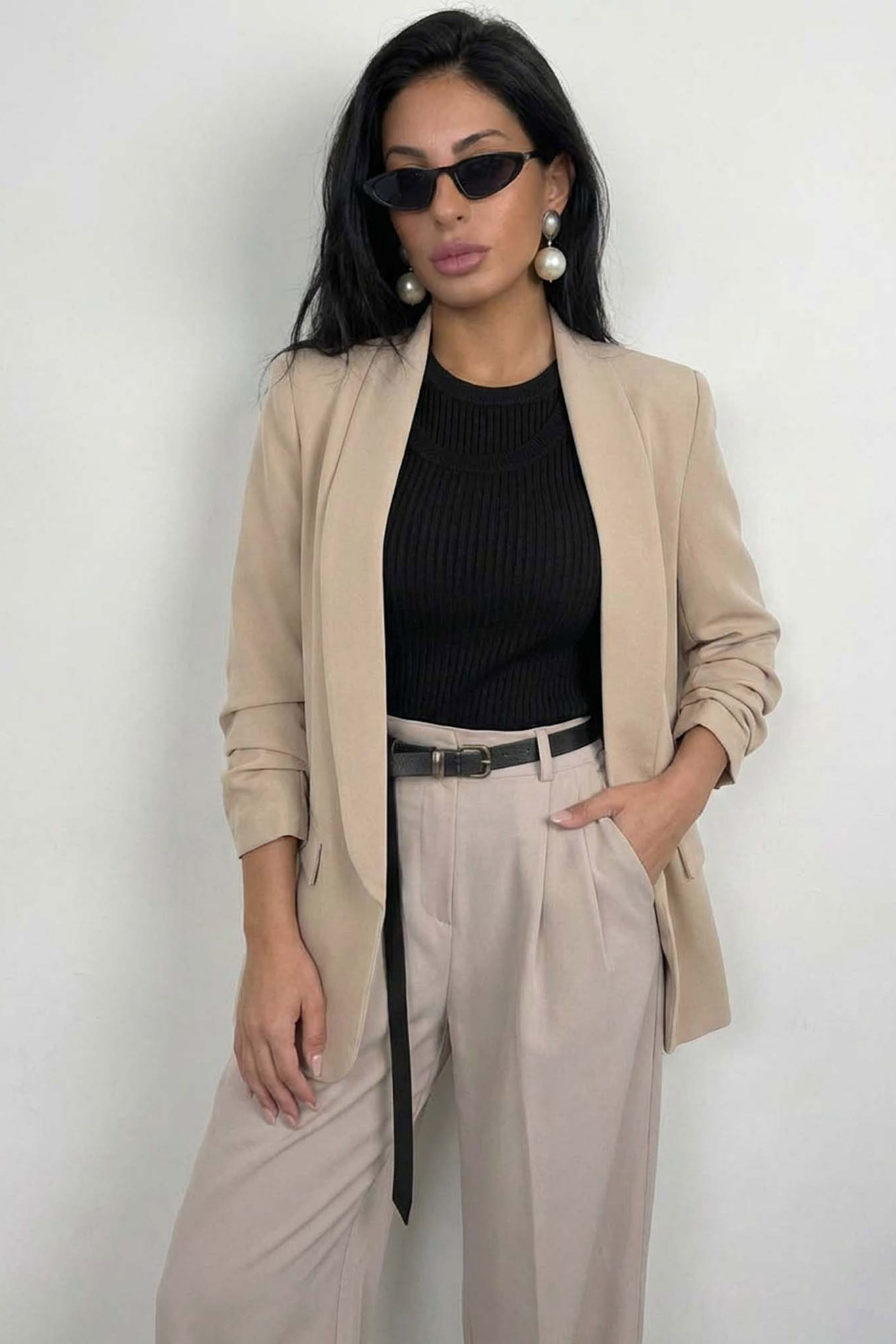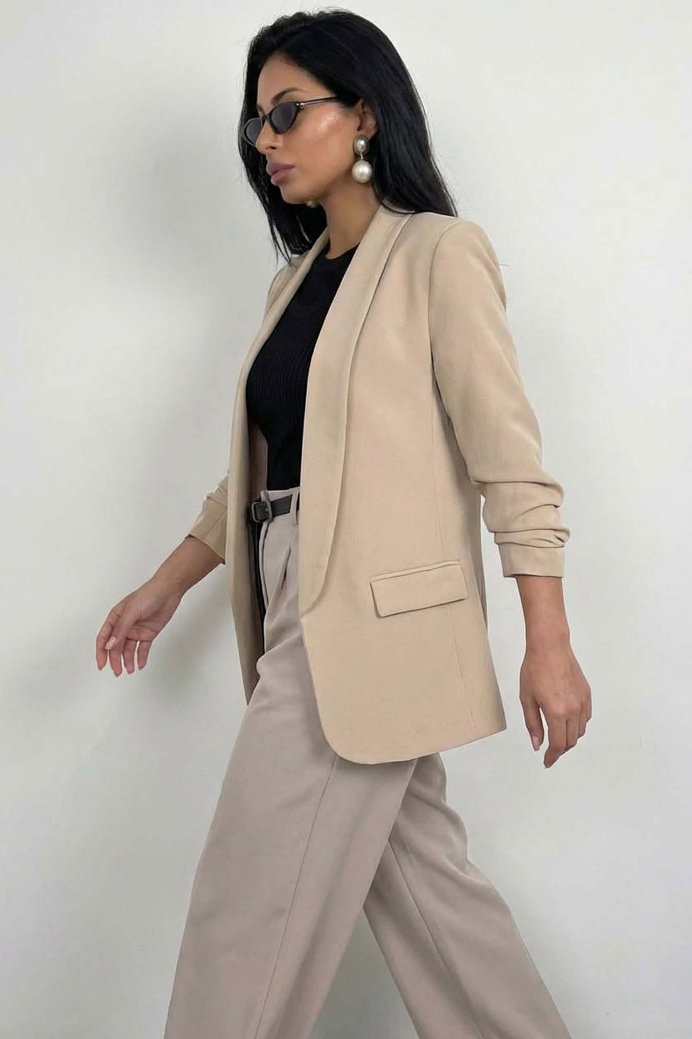 Σακάκι Blazer με Σούρα στα Μανίκια. Διαθέτει ανοιχτό μπροστινό μέρος χωρίς κουμπιά για ένα πιο χαλαρό στυλ.