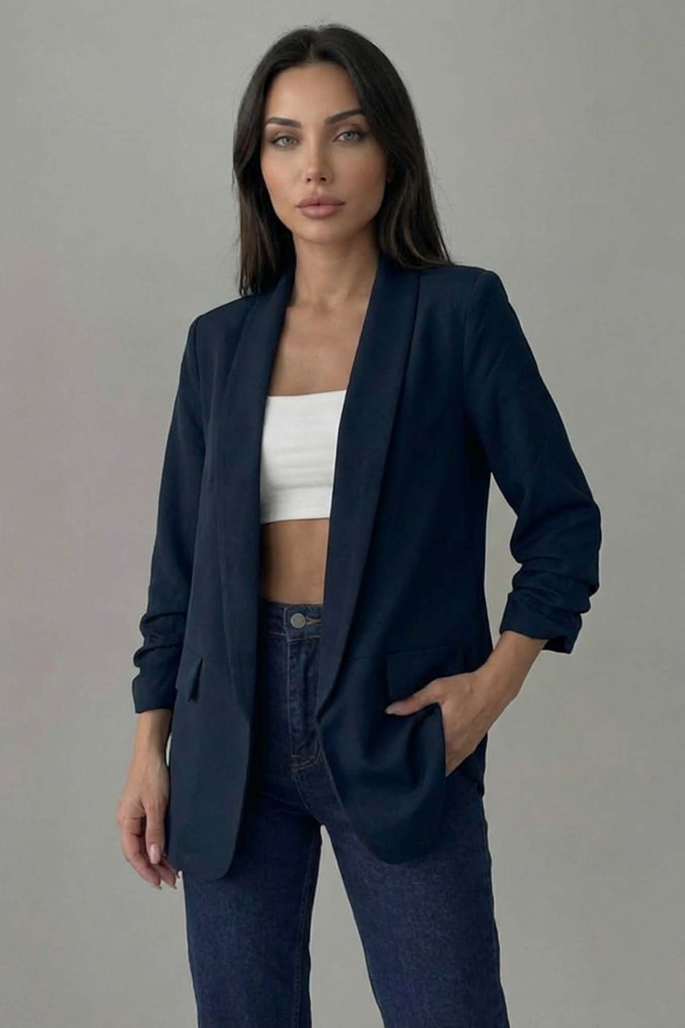 Σακάκι Blazer με Σούρα στα Μανίκια. Διαθέτει ανοιχτό μπροστινό μέρος χωρίς κουμπιά για ένα πιο χαλαρό στυλ.