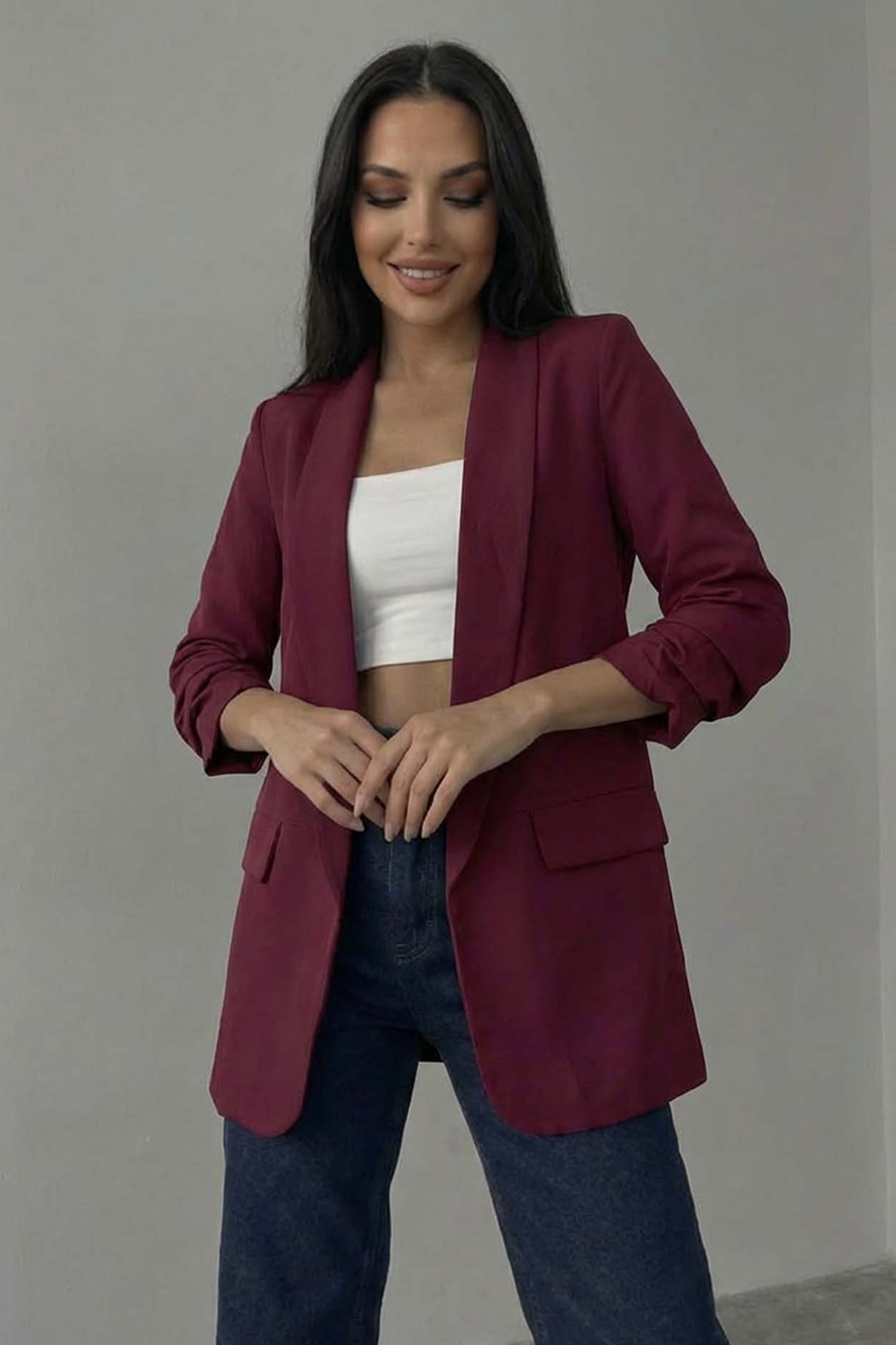 Σακάκι Blazer με Σούρα στα Μανίκια. Διαθέτει ανοιχτό μπροστινό μέρος χωρίς κουμπιά για ένα πιο χαλαρό στυλ.