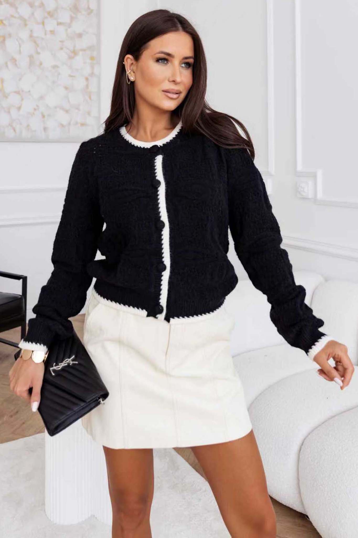 Πλεκτή ζακέτα με κουμπιά και διχρωμία. Λεπτή πλέξη και κανονική εφαρμογή.