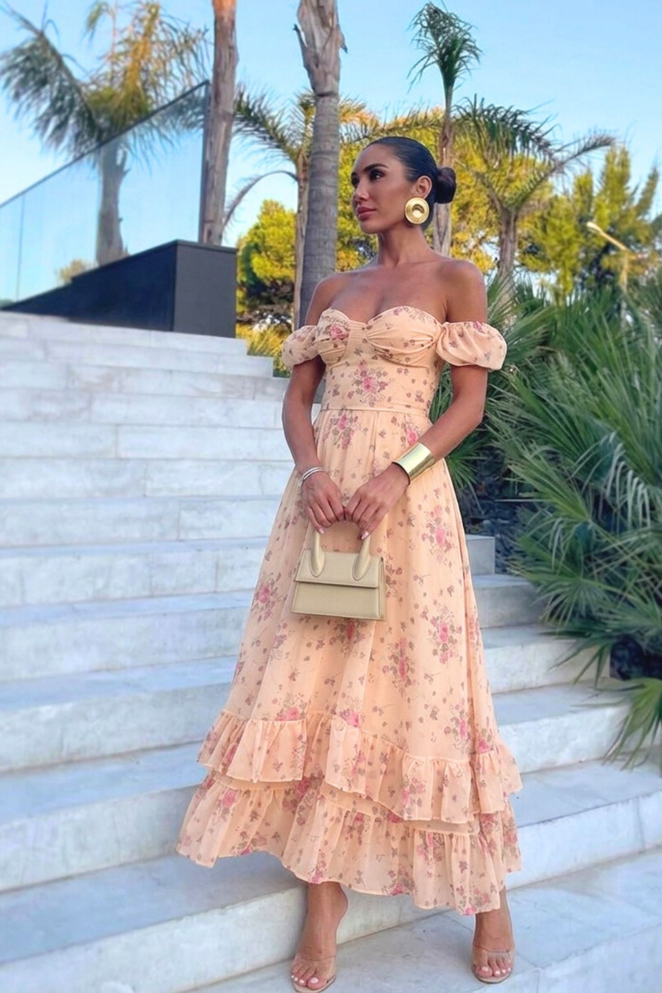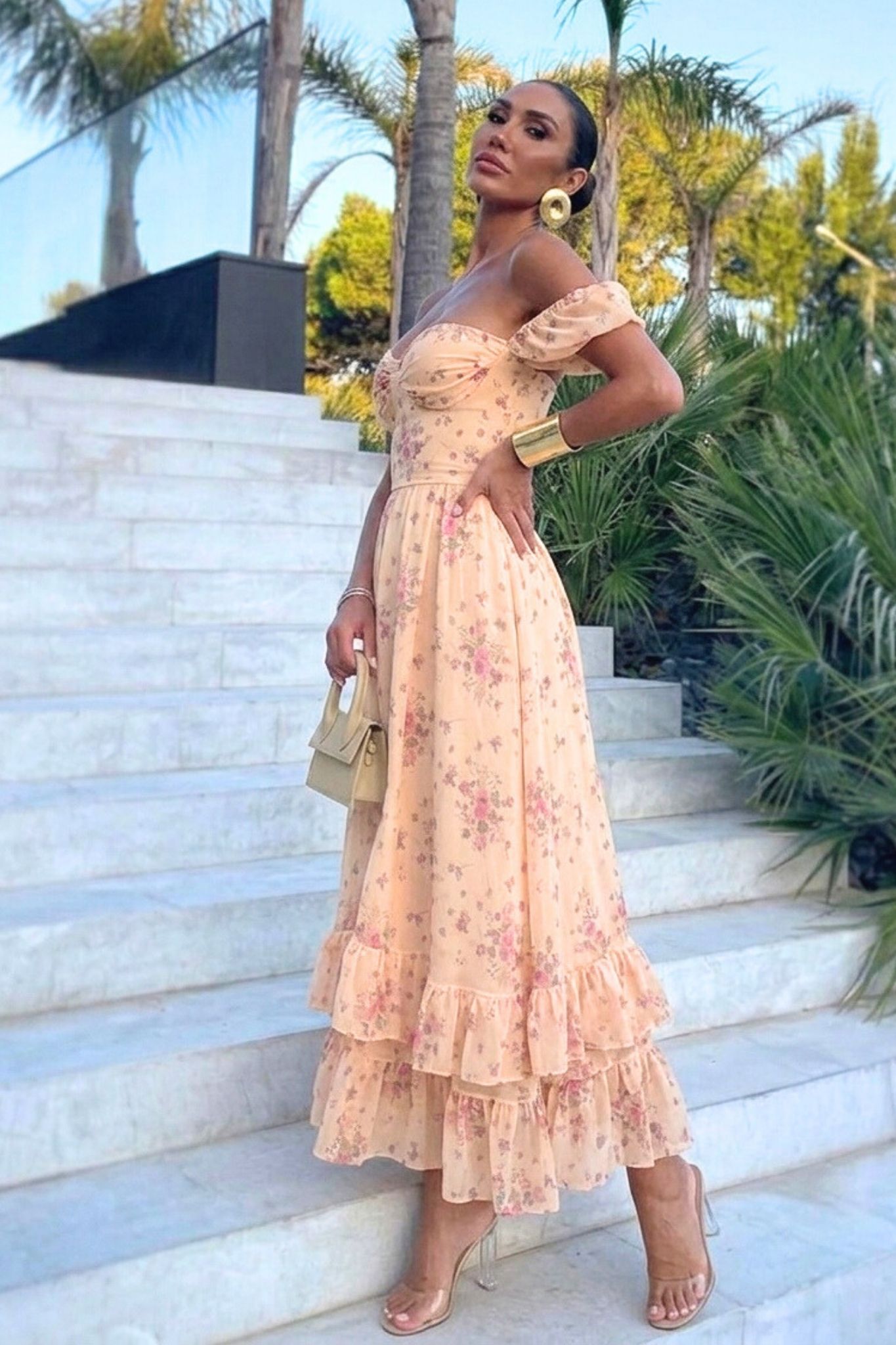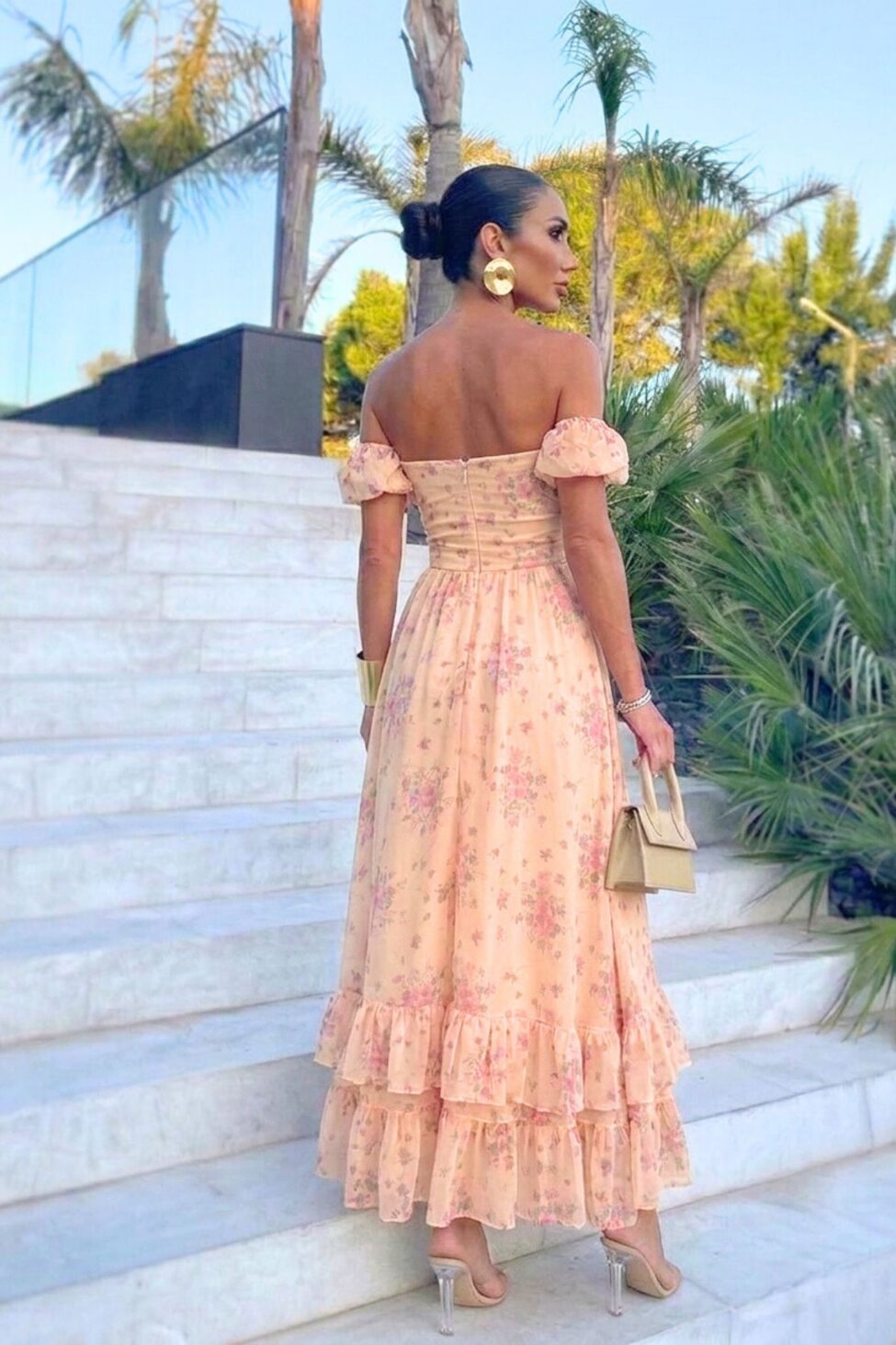 Φόρεμα φλοράλ μακρύ αέρινο με εφαρμοστό μπούστο, off shoulder μανίκια που αναδεικνύουν τους ώμους . Η φούστα με βολάν χαρίζει κίνηση και δημιουργεί ρομαντικό, καλοκαιρινό look ιδανικό για ιδιαίτερες εμφανίσεις. Μήκος 115cm στήθος 70cm