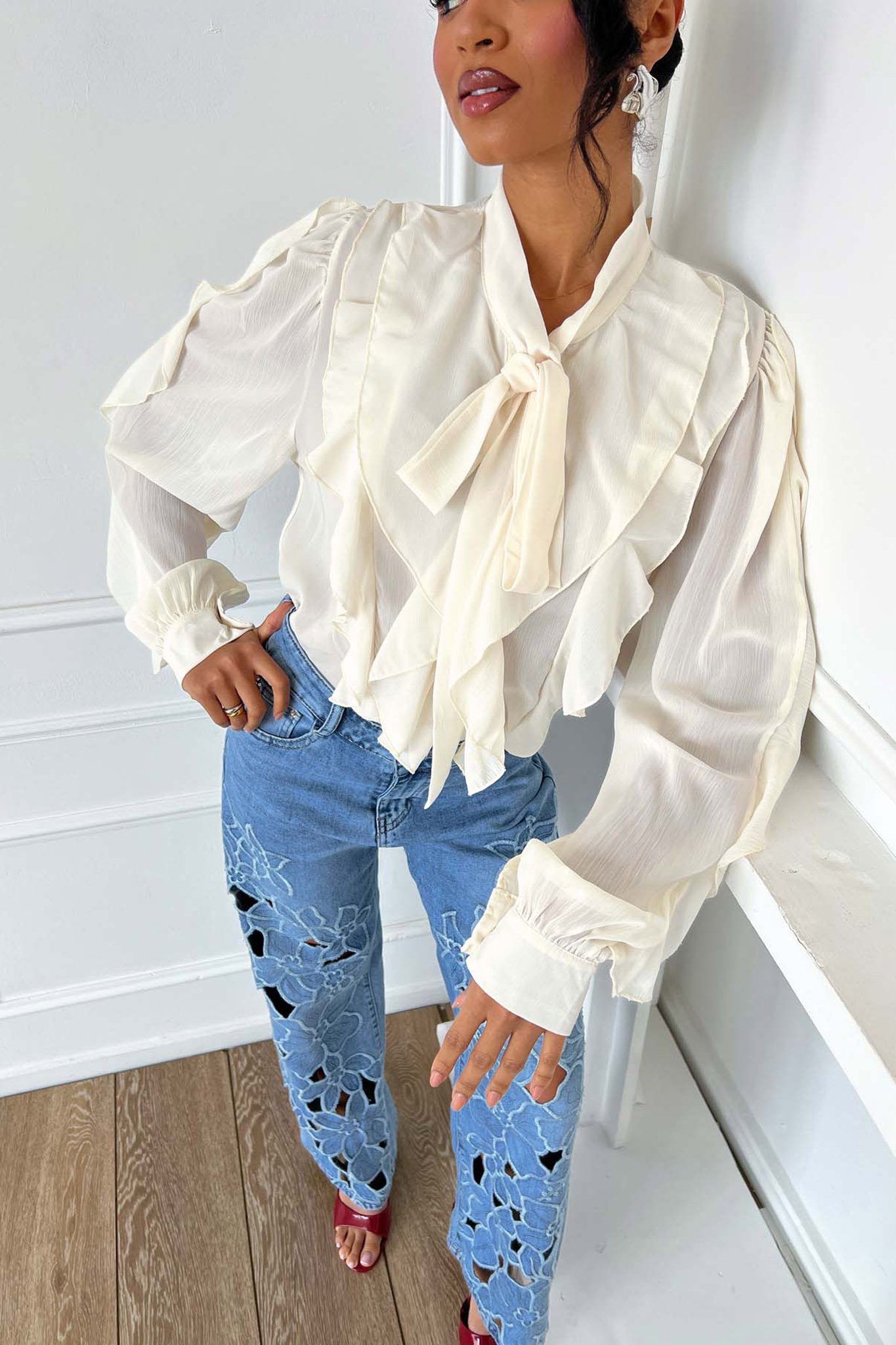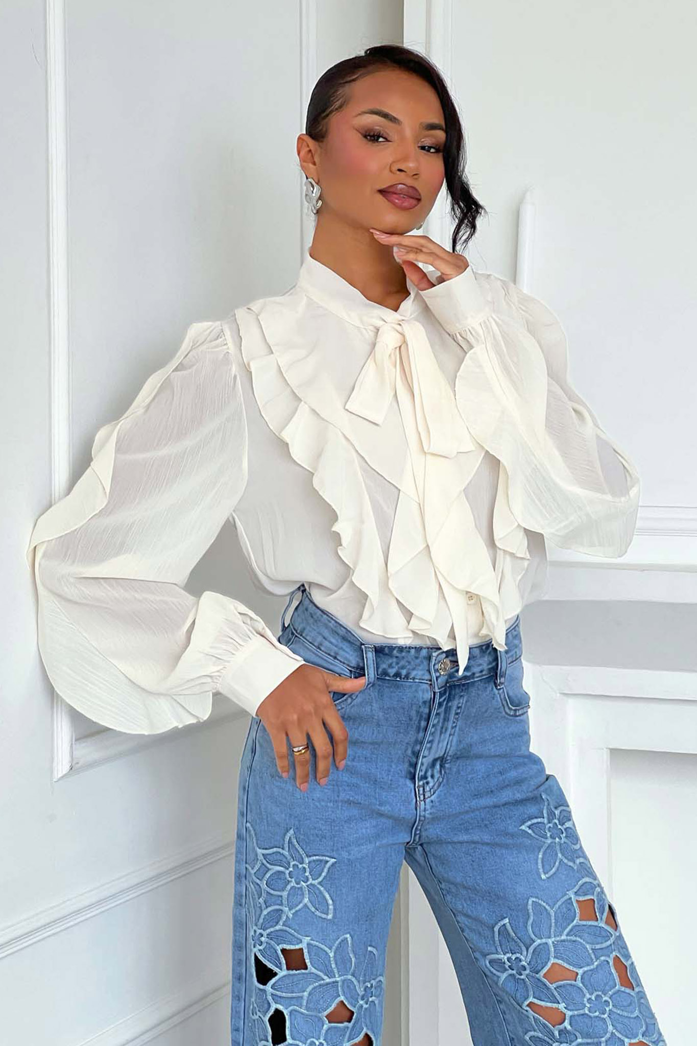 Γυναικείο Ημιδιάφανο Πουκάμισο με Εντυπωσιακά Βολάν & Δέσιμο στο Λαιμό.