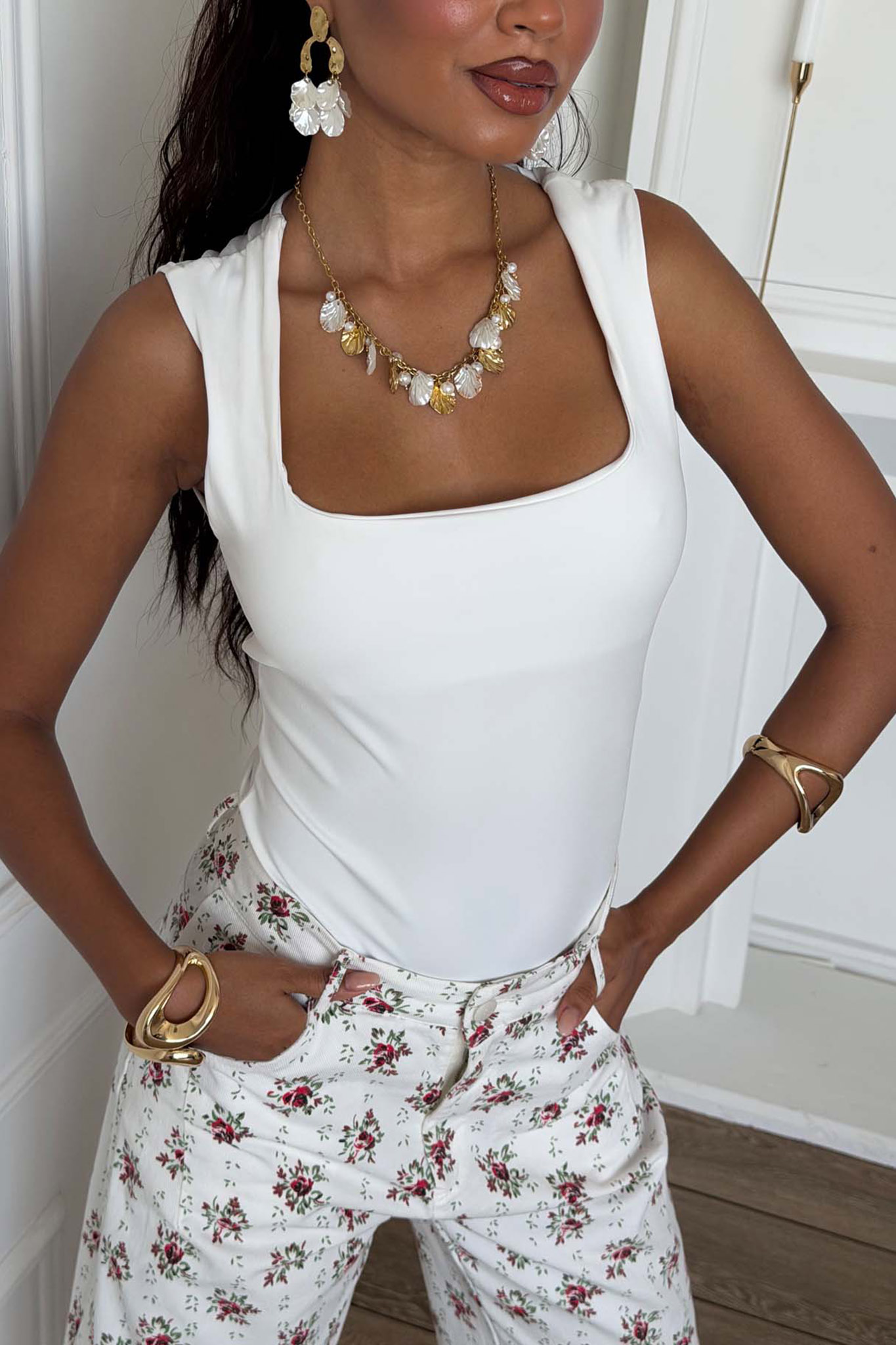 Κορμάκι διαθέτει τετράγωνη λαιμόκοψη και αμάνικο σχεδιασμό με φαρδιές τιράντες. Έχει στενή εφαρμογή που αγκαλιάζει το σώμα και καταλήγει στο κάτω μέρος σε κλείσιμο με κουμπώματα, εξασφαλίζοντας σταθερότητα όταν φοριέται μέσα από ρούχα.