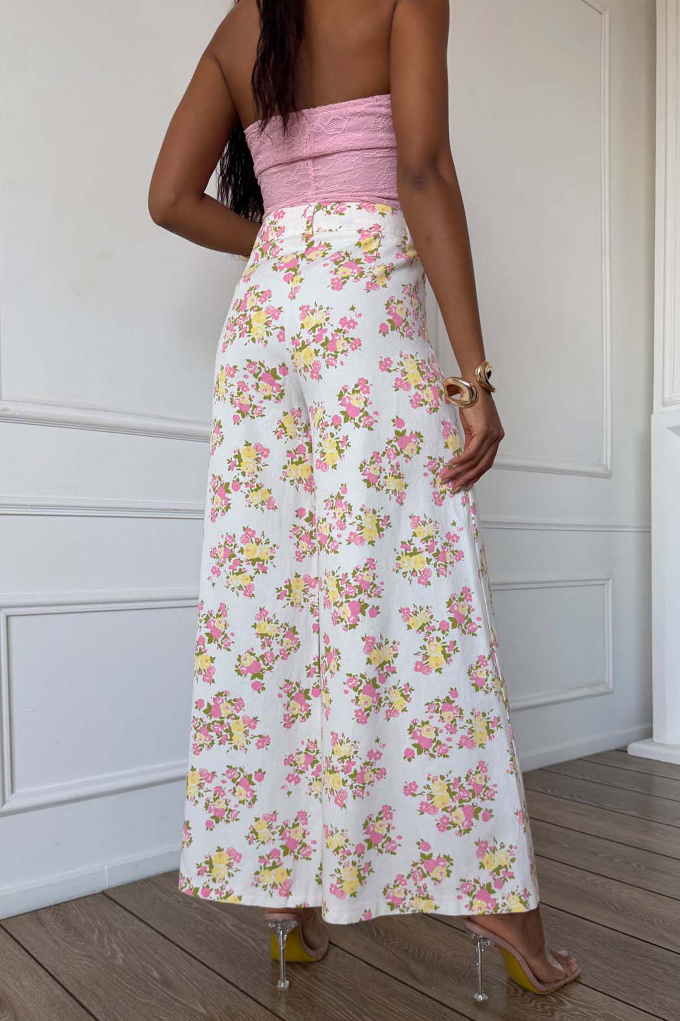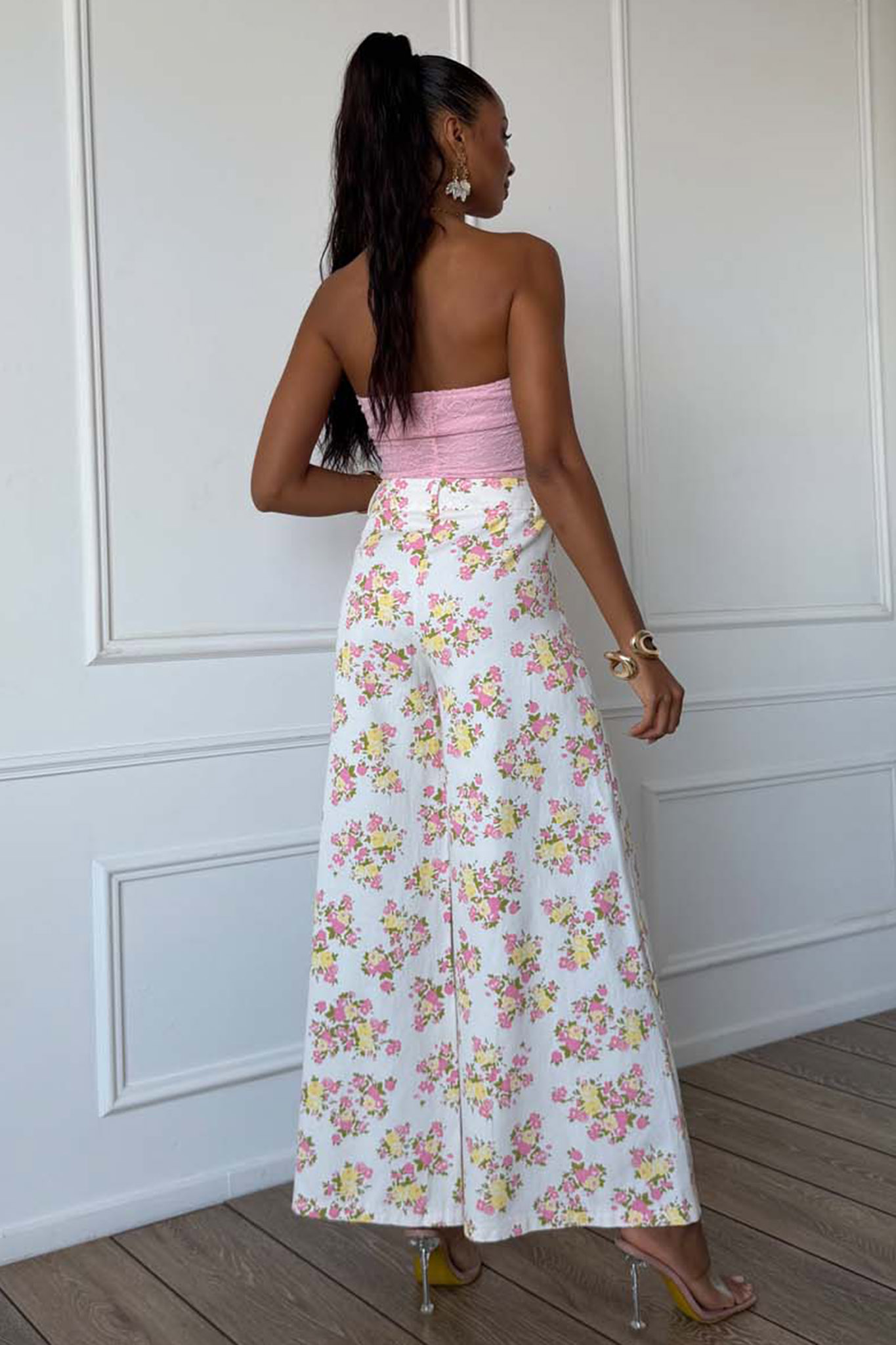 Ψηλόμεσο παντελόνι σε άνετη, ίσια γραμμή με φλοράλ μοτίβο που καλύπτει όλη την επιφάνεια του υφάσματος. Διαθέτει κλασικό κλείσιμο με κουμπί και φερμουάρ, θηλιές για ζώνη στη μέση, καθώς και πρακτικές τσέπες στο μπροστινό μέρος, θυμίζοντας τον σχεδιασμό ενός τζιν, αλλά σε ένα πιο ελαφρύ και ανοιξιάτικο στυλ.