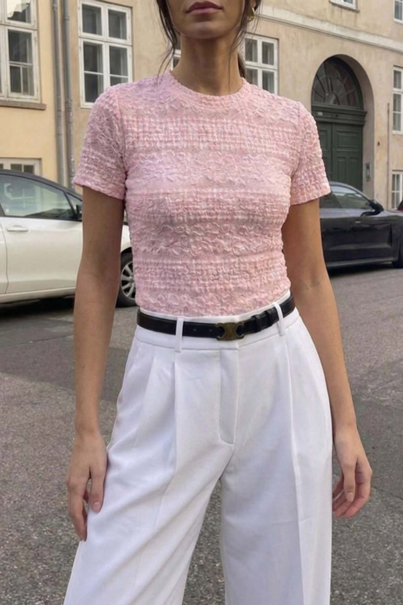 Κοντομάνικη μπλούζα με υφή γκοφρέ. Διαθέτει ανάγλυφη, ελαστική ύφανση που δημιουργεί ένα εντυπωσιακό οπτικό αποτέλεσμα και χαρίζει θηλυκότητα.